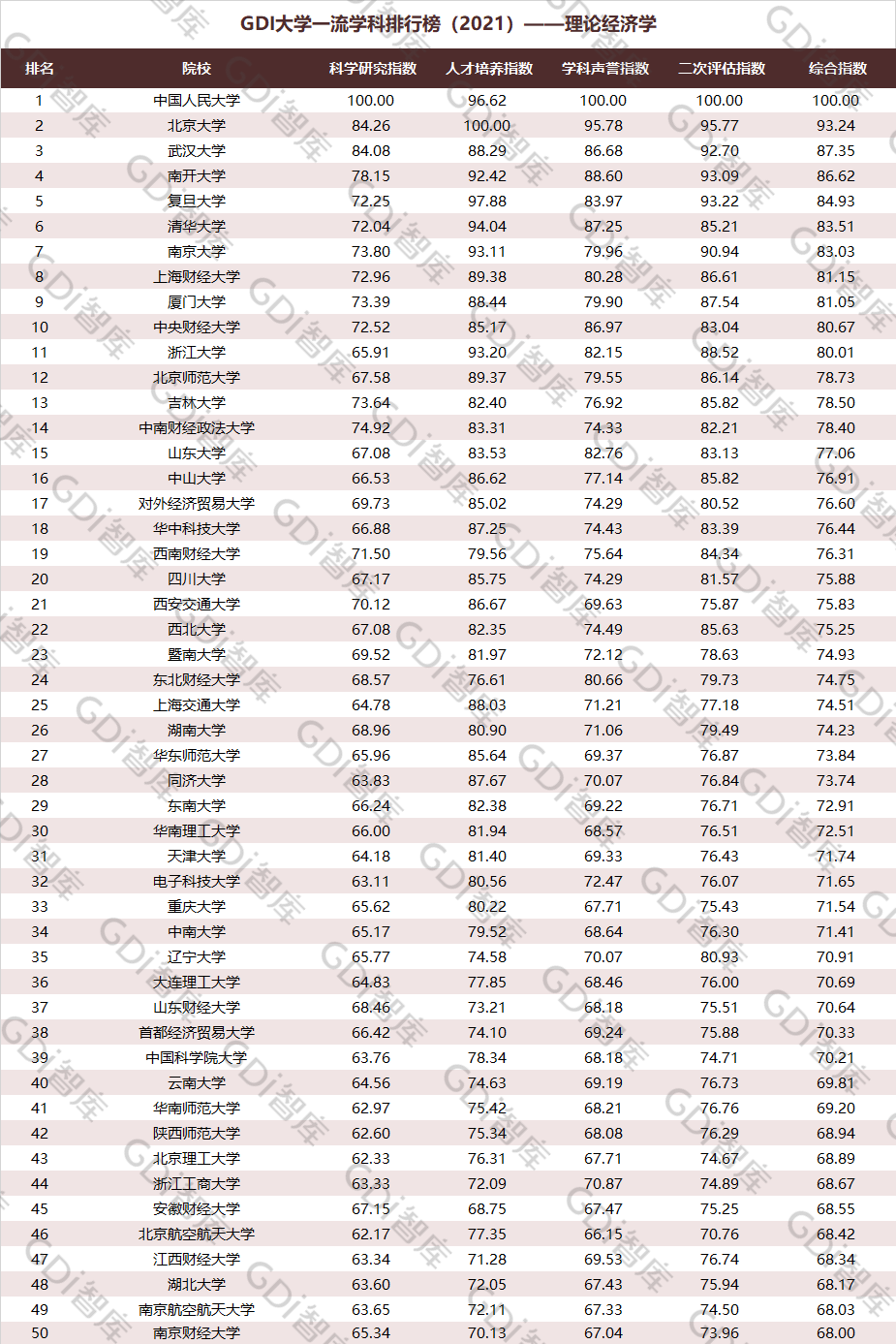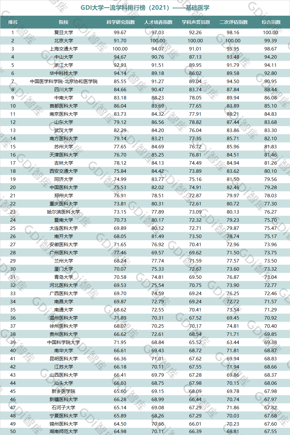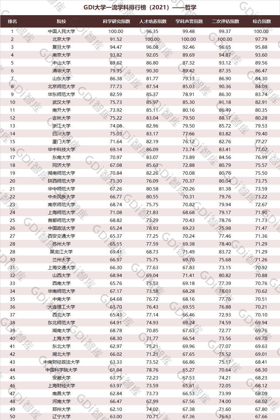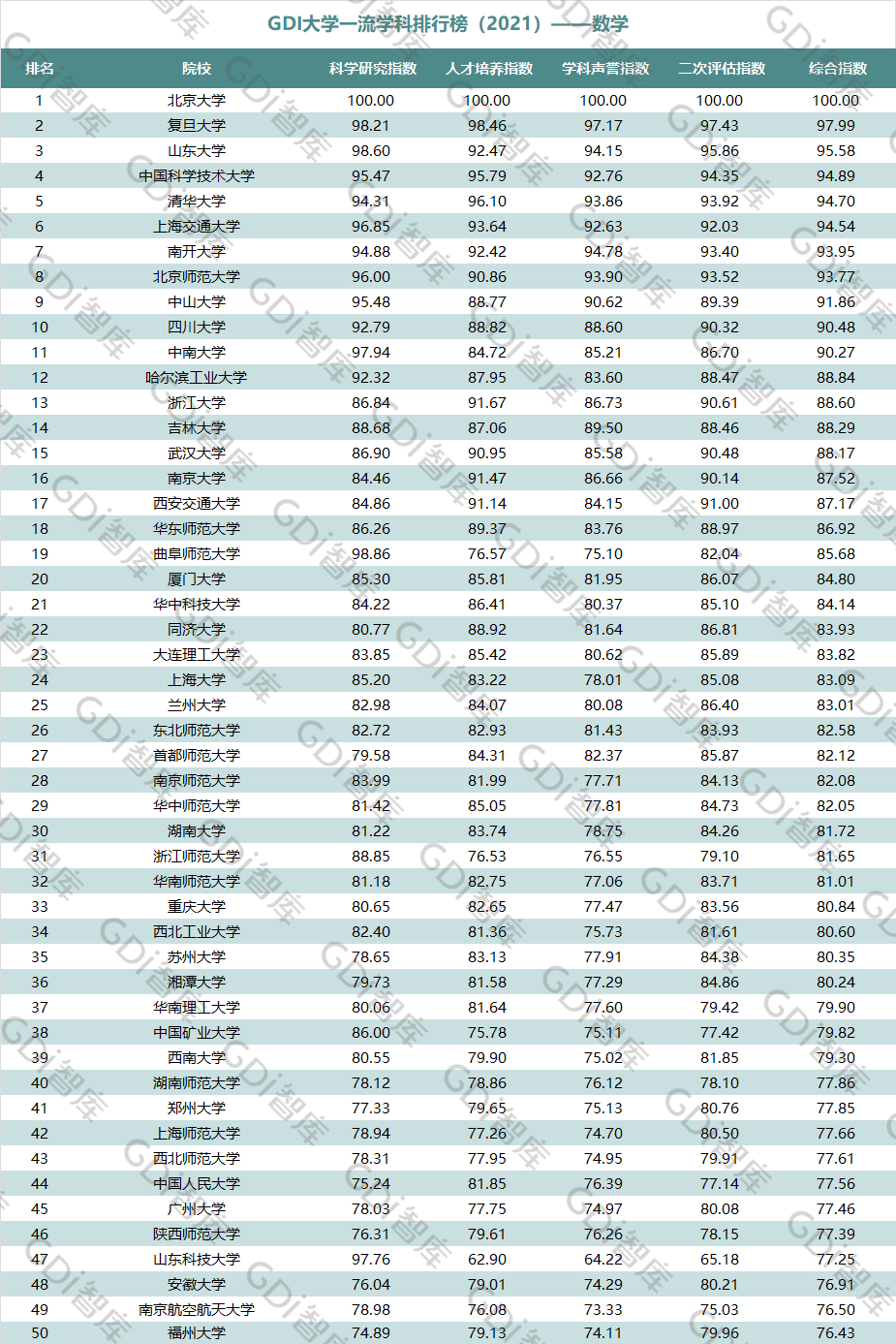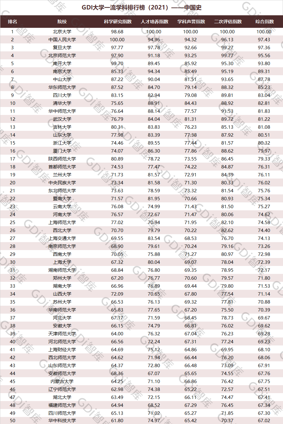 2021年6月15日,GDI智库发布“GDI大学一流学科排行榜(2021)”,通过科学研究指数、人才培养指数、学科声誉指数和二次评估指数四大一级指标科学评价518所院校的90个学科,艺术类学科不在本次评价范围。