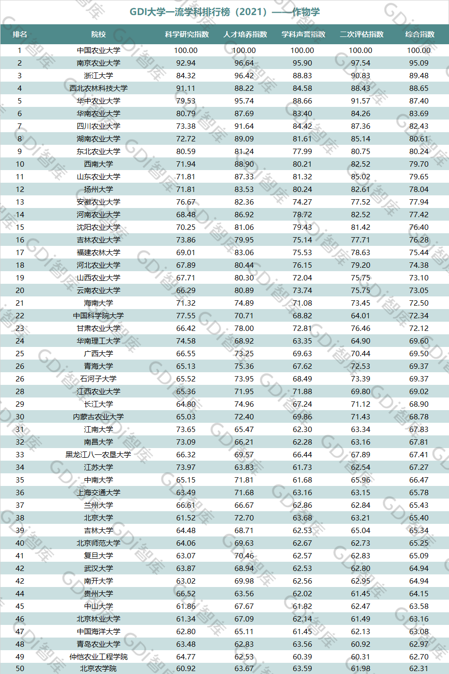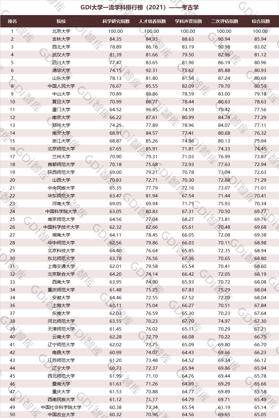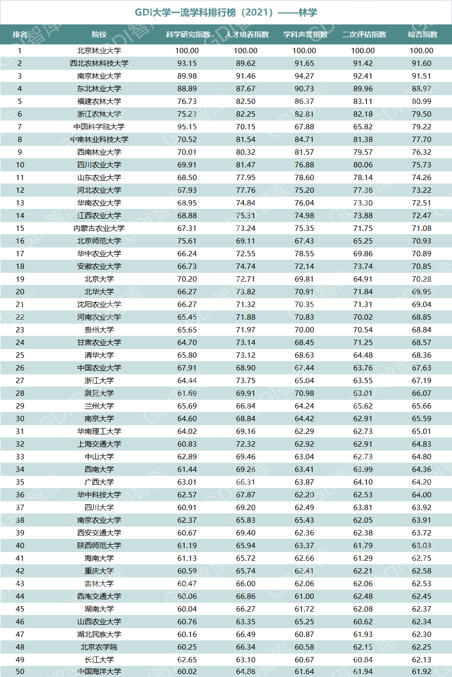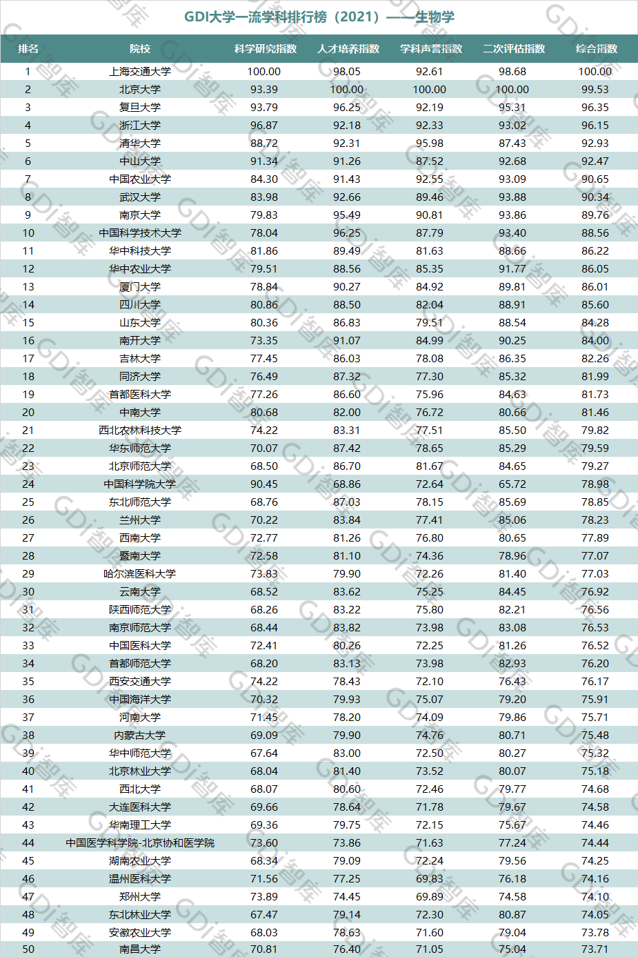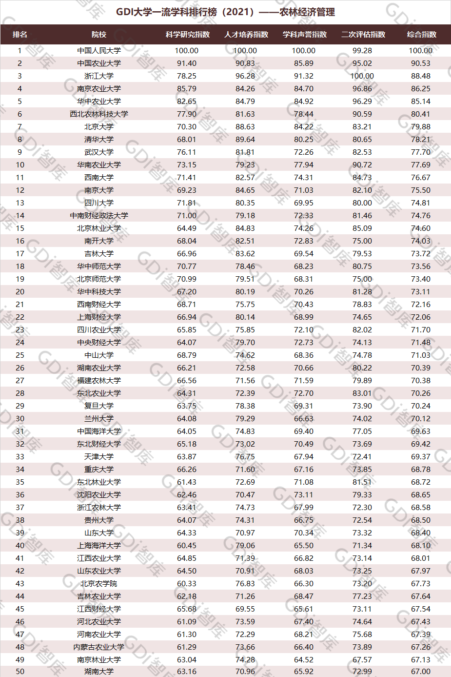 2021年6月15日,GDI智库发布“GDI大学一流学科排行榜(2021)”,通过科学研究指数、人才培养指数、学科声誉指数和二次评估指数四大一级指标科学评价518所院校的90个学科,艺术类学科不在本次评价范围。