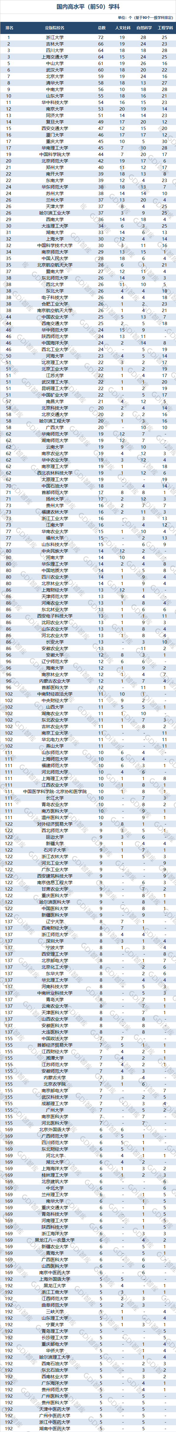 518所院校中有288所的自然科学学科一级学科进入“国内高水平学科(前50)”,其中浙江大学28个,中山大学26个,北京大学、上海交通大学和吉林大学各24个。