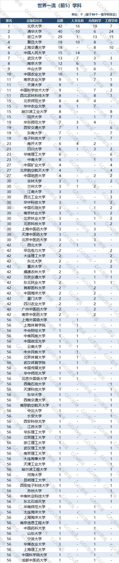 据以上标准统计,在拥有“世界一流学科(前5)”数量方面,北京大学以42个学科位居第一,清华大学的数量为40个,排名第二,排名第三的是浙江大学(29个)。排名第四到第十的院校分别是:复旦大学(18个)、上海交通大学(18个)、中国人民大学(15个)、武汉大学(13个)、南京大学(12个)、中山大学(11个)、中国农业大学(10个)。