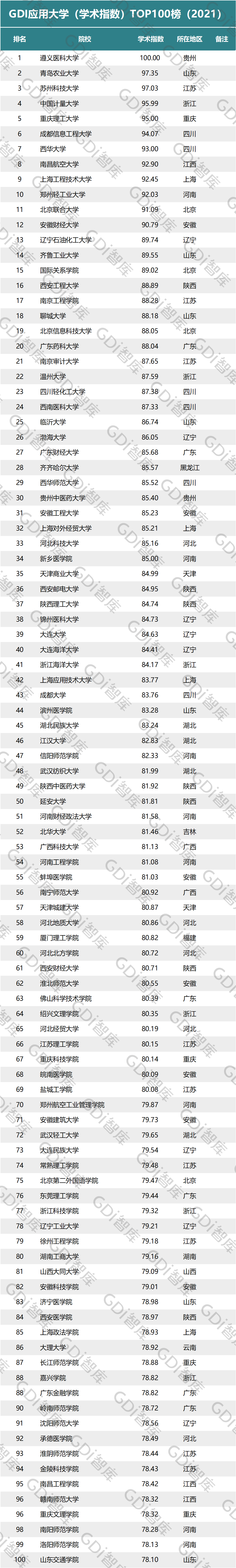 “GDI应用大学(学术指数)TOP100榜(2021)”上榜高校均为公办本科普通高校,其中,学术指数在90以上的高校12所,前五强高校学术指数均在95及以上。