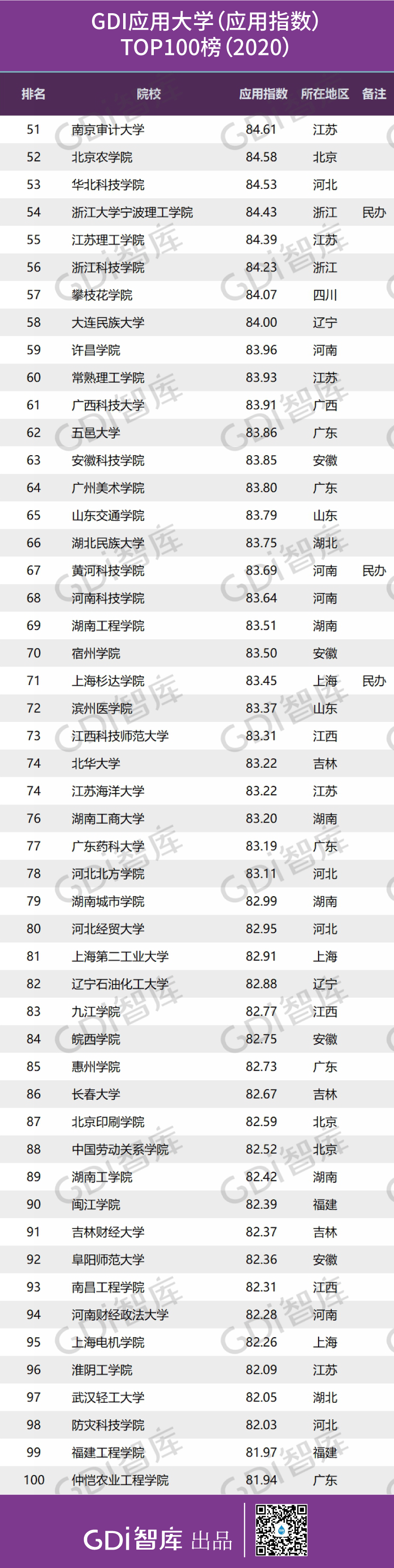 2020年5月17日,广州日报数据和数字化研究院(GDI智库)发布“GDI应用大学排行TOP800榜(2020)”(以下简称“GDI应用大学排行榜”),围绕应用指数、学术指数、声誉指数、二次评估指数四个一级指标建构综合指数,科学评价国内910所本科院校(非博士培养单位),推出“GDI应用大学排行榜(2020)”主榜单以及四个子榜单。