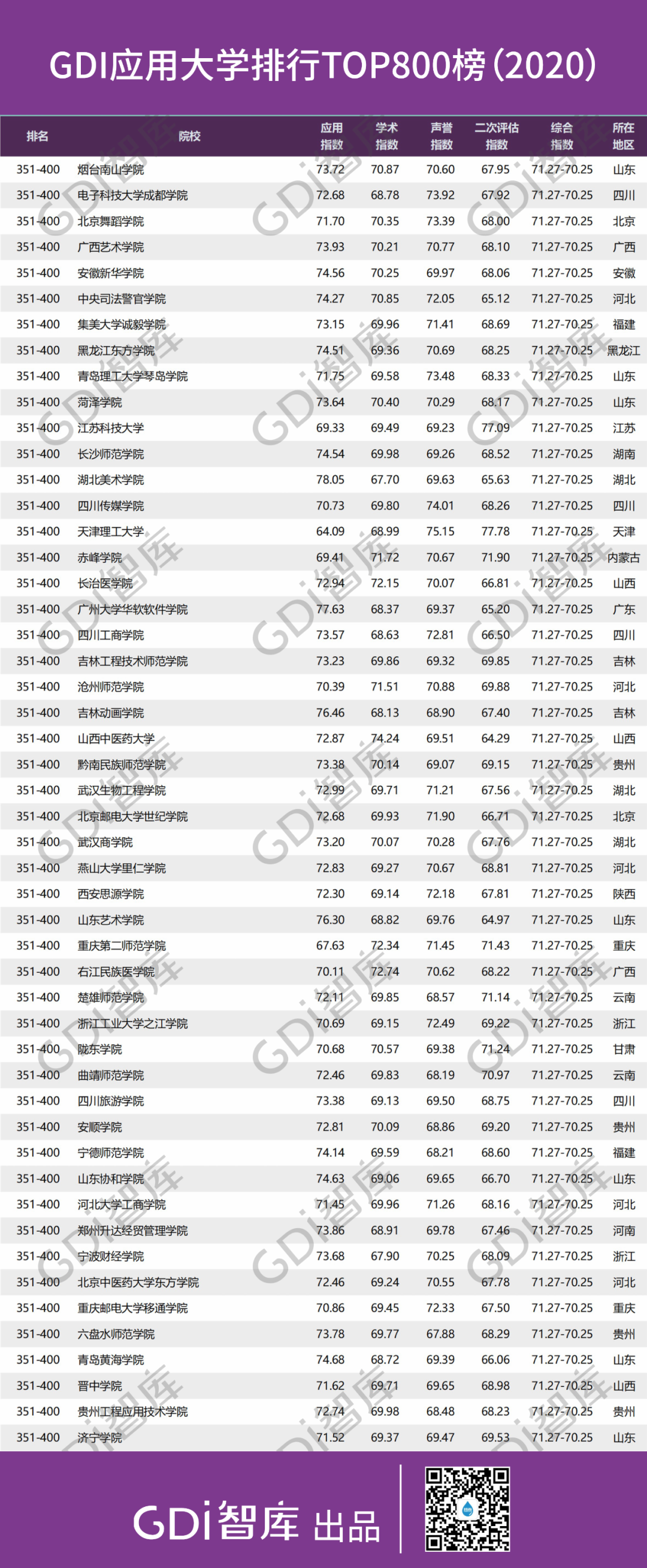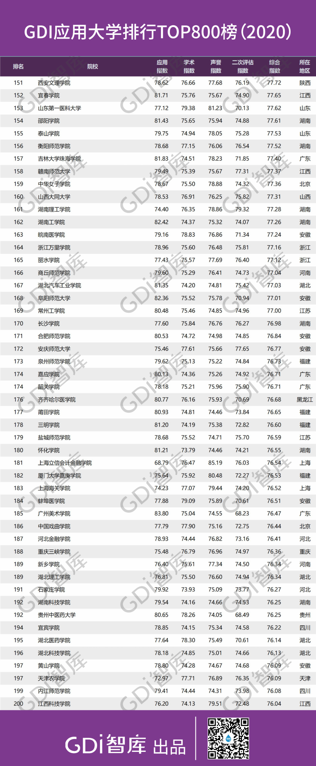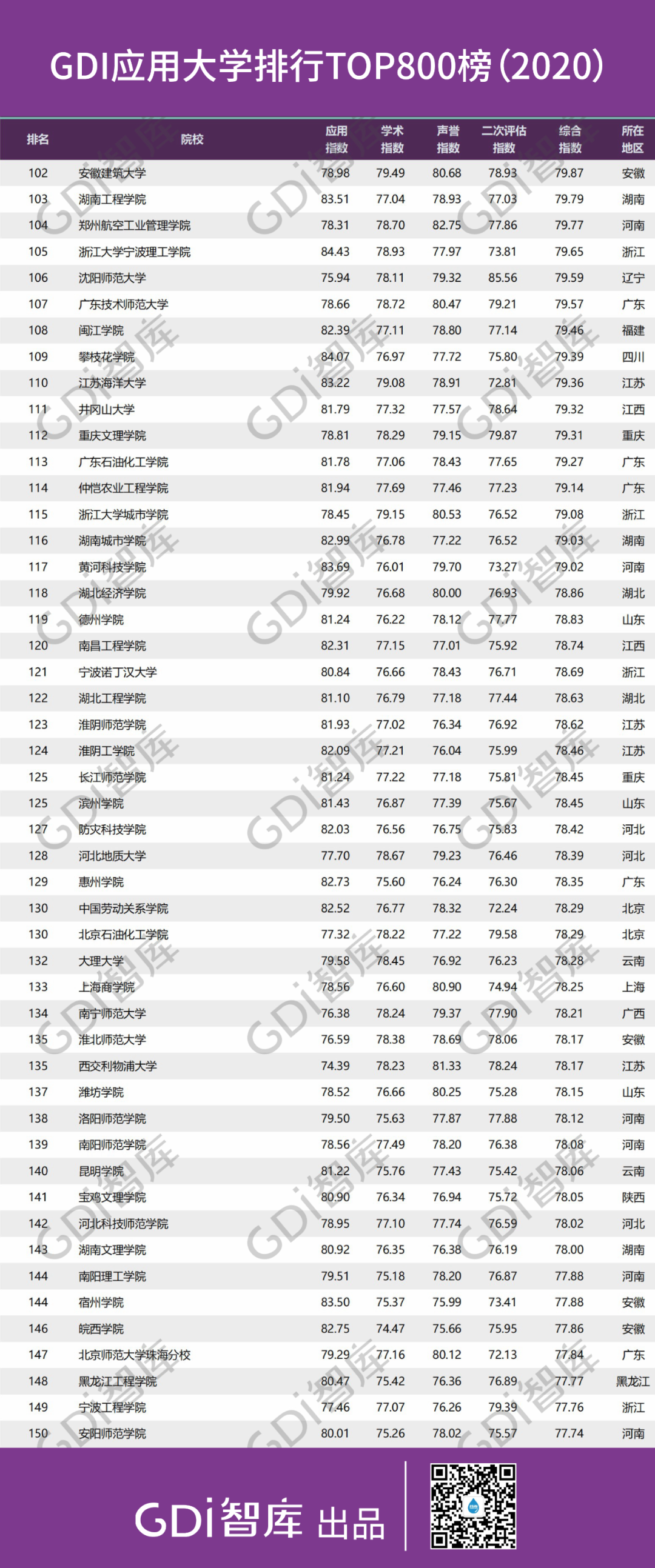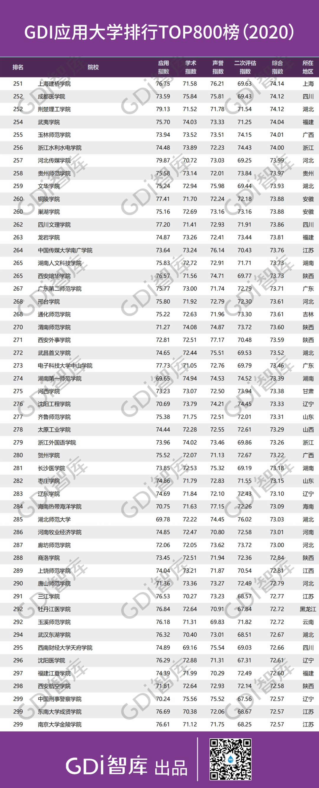 2020年5月17日,广州日报数据和数字化研究院(GDI智库)发布“GDI应用大学排行TOP800榜(2020)”(以下简称“GDI应用大学排行榜”),围绕应用指数、学术指数、声誉指数、二次评估指数四个一级指标建构综合指数,科学评价国内910所本科院校(非博士培养单位),推出“GDI应用大学排行榜(2020)”主榜单以及四个子榜单。