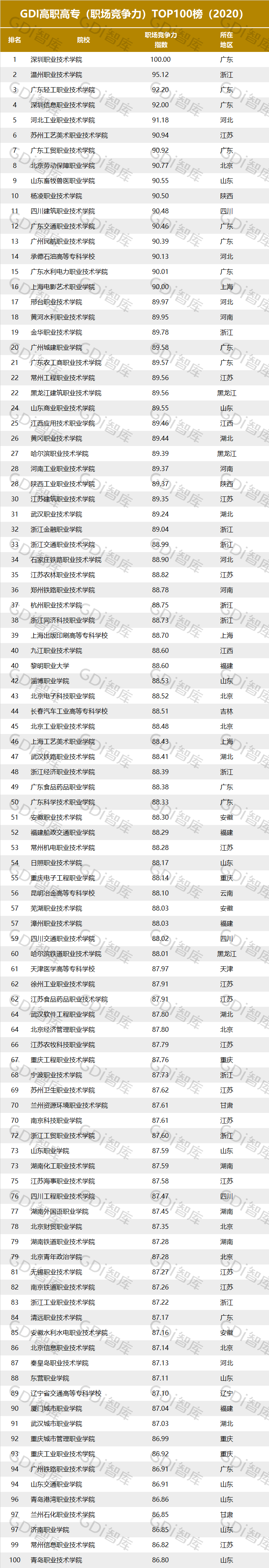 在“GDI高职高专(职场竞争力)TOP100榜(2020)”中,深圳职业技术学院表现出色,职场竞争力指数获得满分;其次是温州职业技术学院,职场竞争力指数为95.12;紧随其后的是广东轻工业职业技术学院(92.20);排名第4的院校为深圳信息职业技术学院(92.00);河北工业职业技术学院(91.18)则名列第5。排名前10的其余院校分别为苏州工艺美术职业技术学院(90.94)、广东工贸职业技术学院(90.92)、北京劳动保障职业学院(90.77)、山东畜牧兽医职业学院(90.55)、杨凌职业技术学院(90.50)。