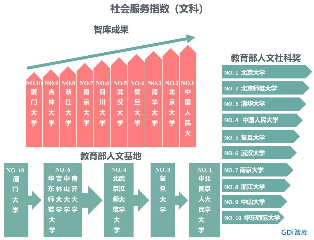 在文科社会服务指数中,教育部人文社科奖TOP3高校依次是北京大学、北京师范大学、清华大学;智库成果TOP3高校依次是中国人民大学、北京大学、清华大学;教育部人文基地TOP3高校依次是中国人民大学、北京大学、复旦大学。