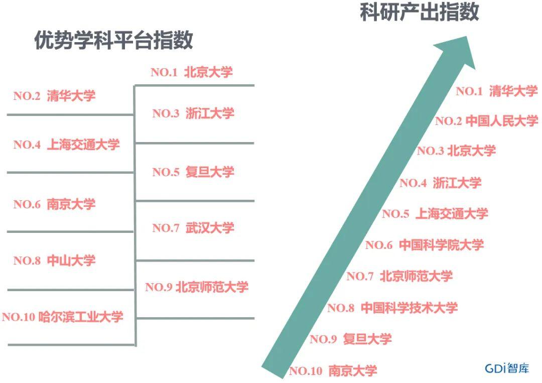 科学研究指数聚焦高校的科研成果,在对高校学科基础水平进行评估的基础上,分类评价文科、理工科高校科研产出。科学研究指数包含优势学科平台指数和科研产出指数等二级指标。优势学科平台指数TOP3高校依次是北京大学、清华大学、浙江大学;科研产出指数TOP3高校依次是清华大学、中国人民大学、北京大学。