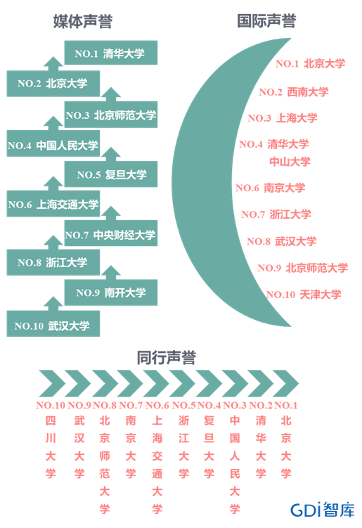 其中,同时进入同行声誉、媒体声誉、国际声誉TOP10的高校是北京大学、清华大学、北京师范大学、浙江大学、武汉大学。