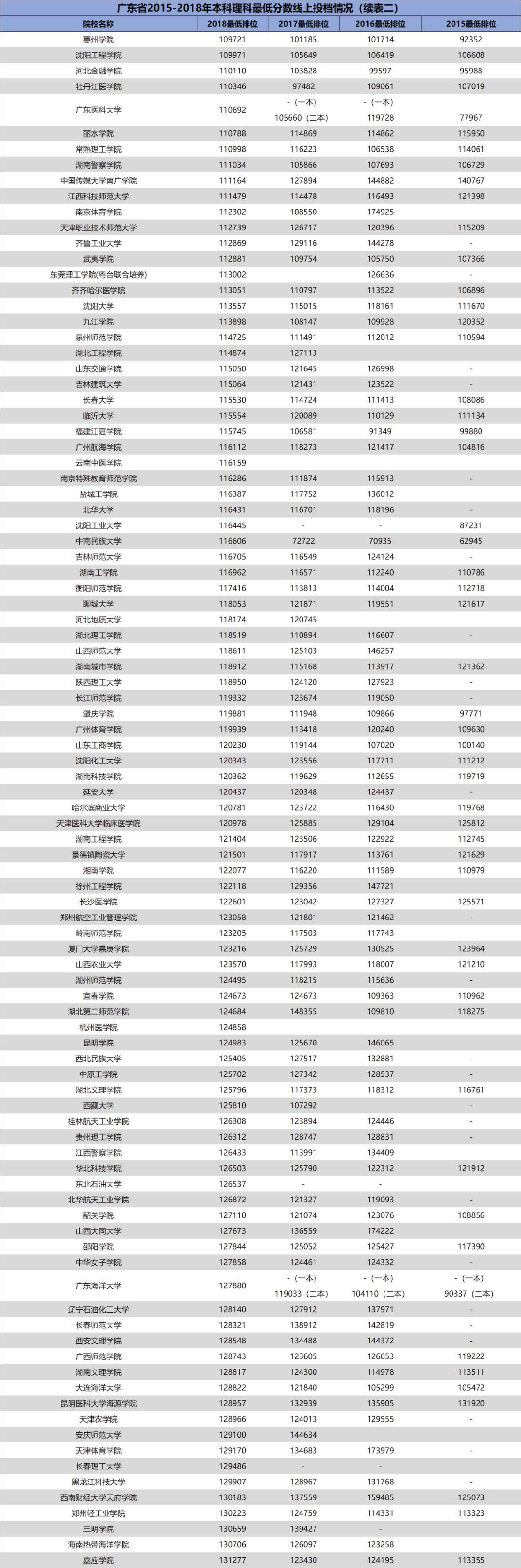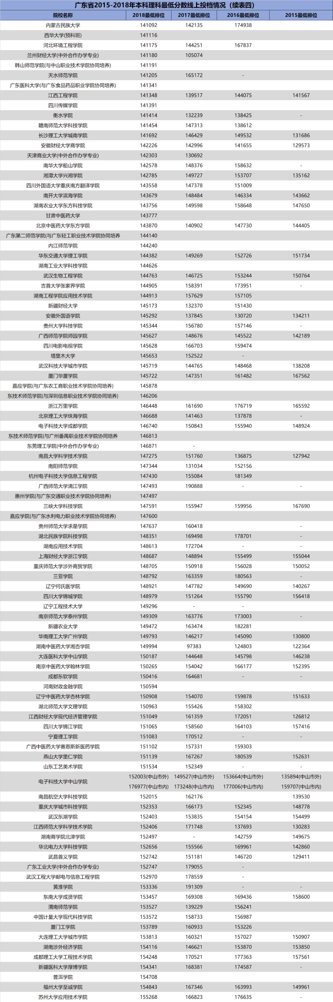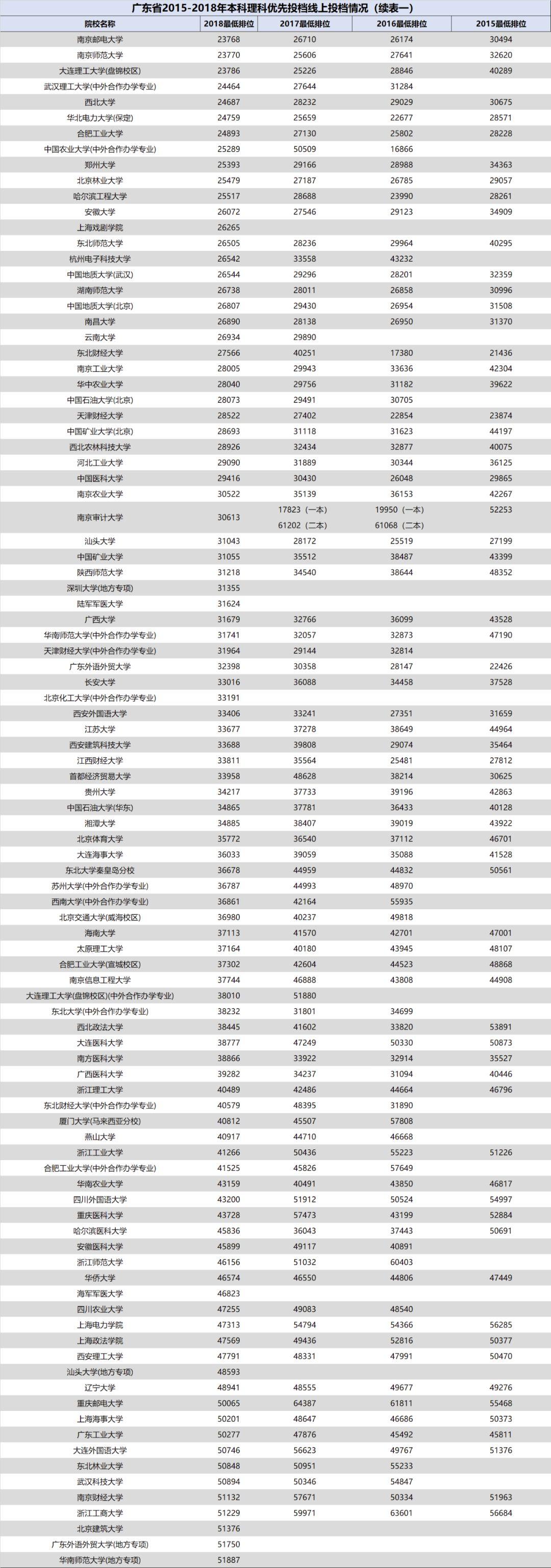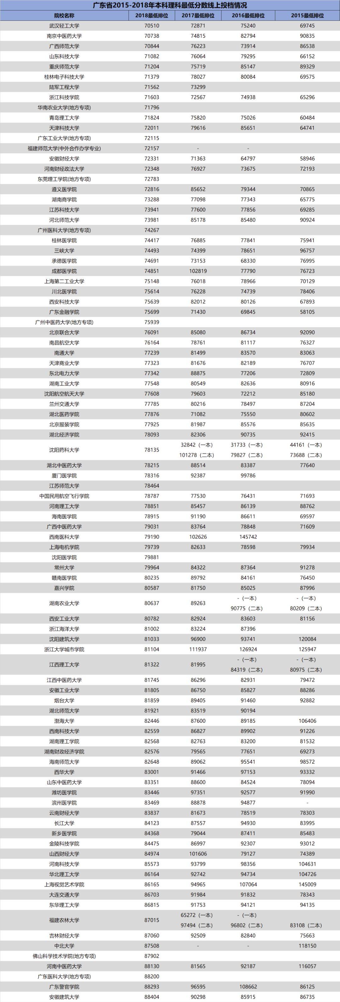 3.自2018年开始广东省一本、二本合并,本科分为优先投档线与最低分数线。2018年部分院校在优先投档线与最低分数线中均有投档情况,此类院校仅保留最低分数线的最低排位。