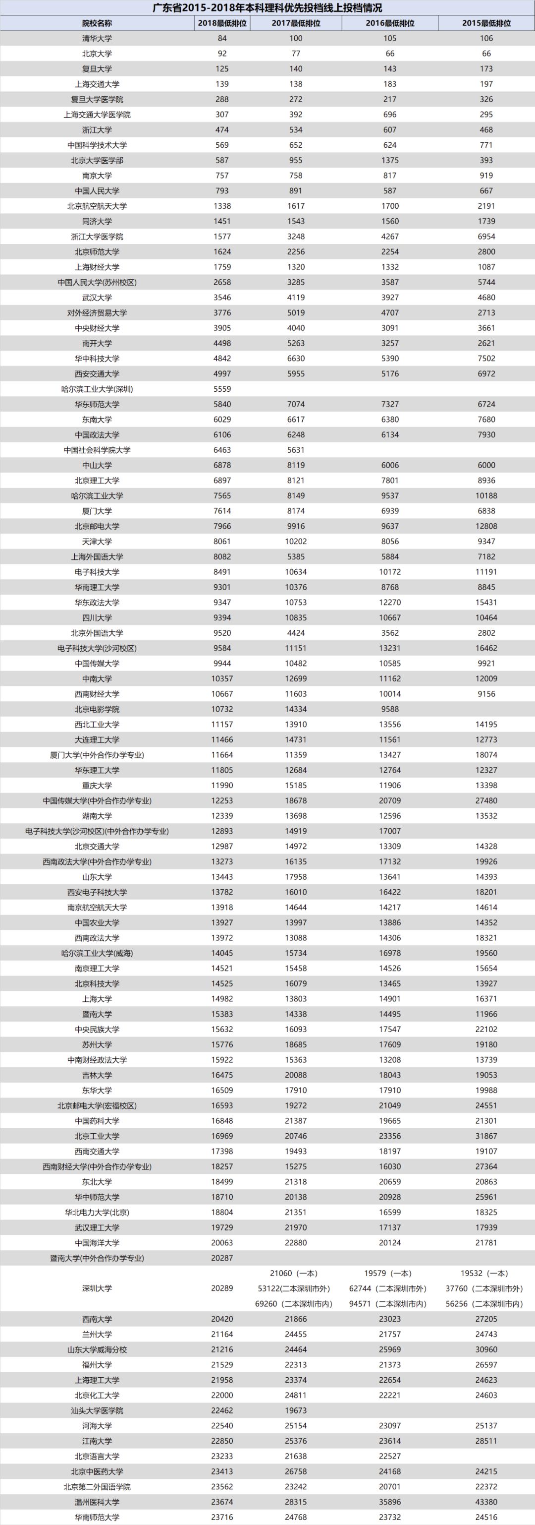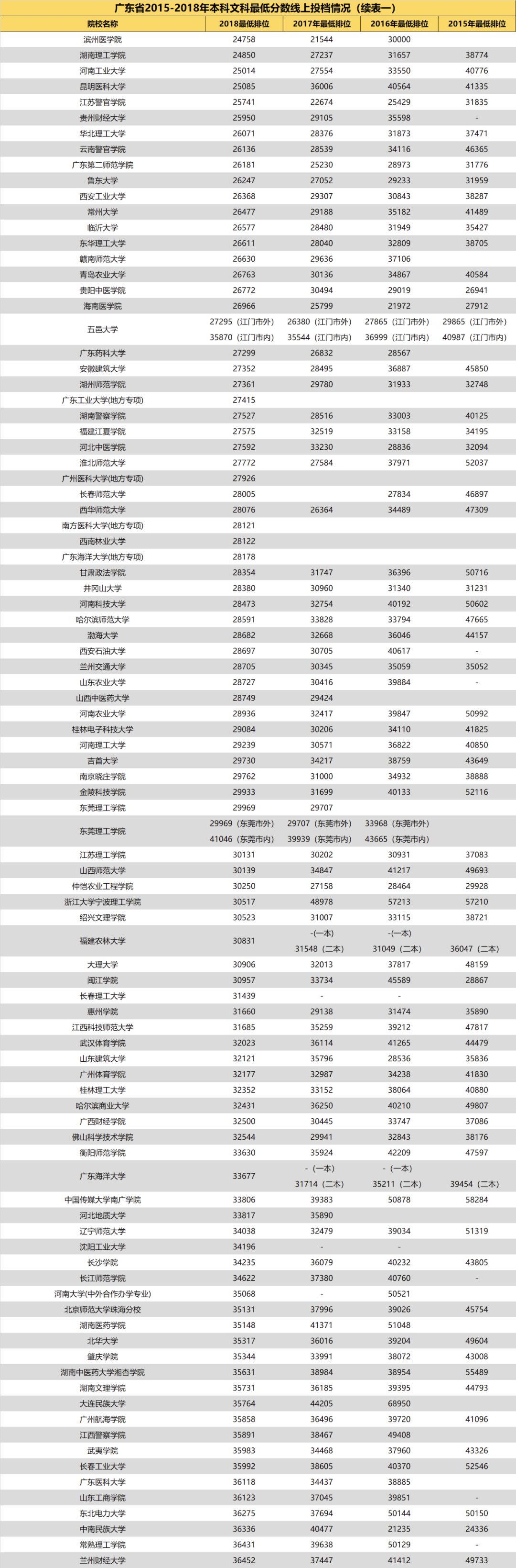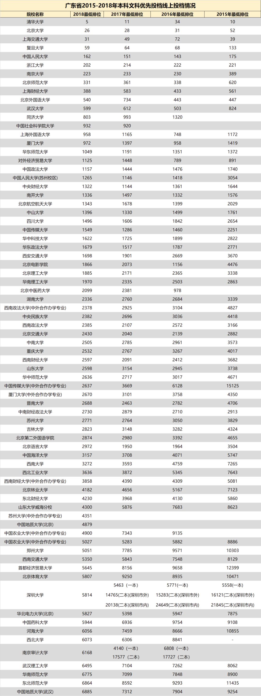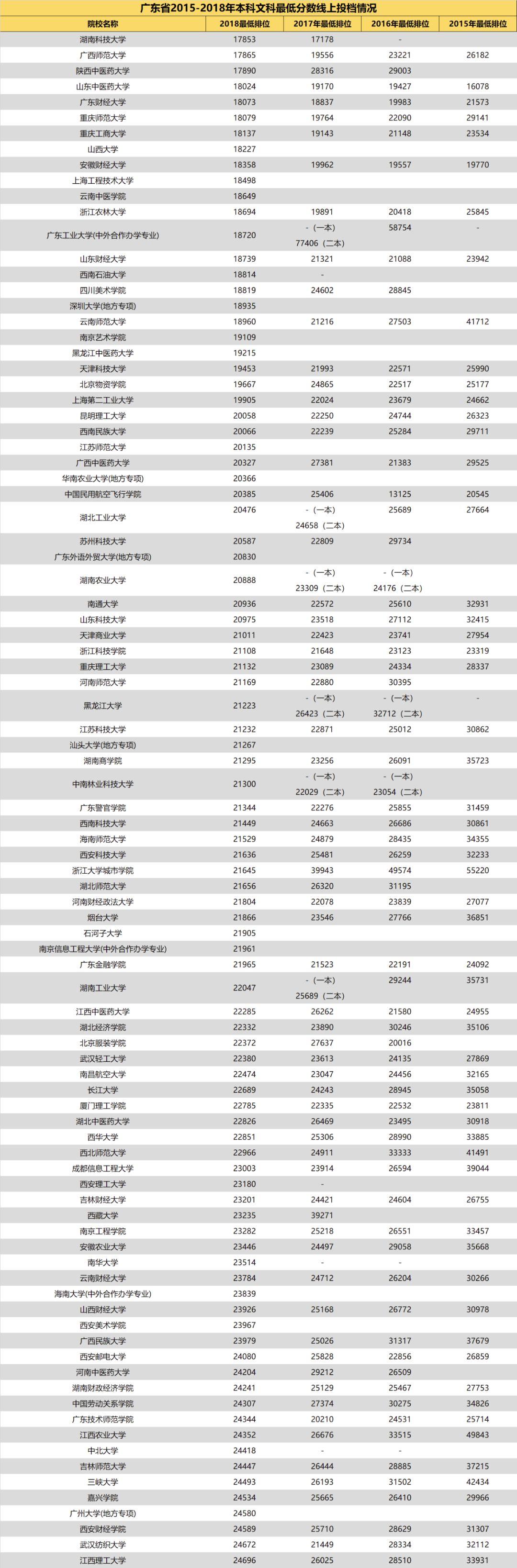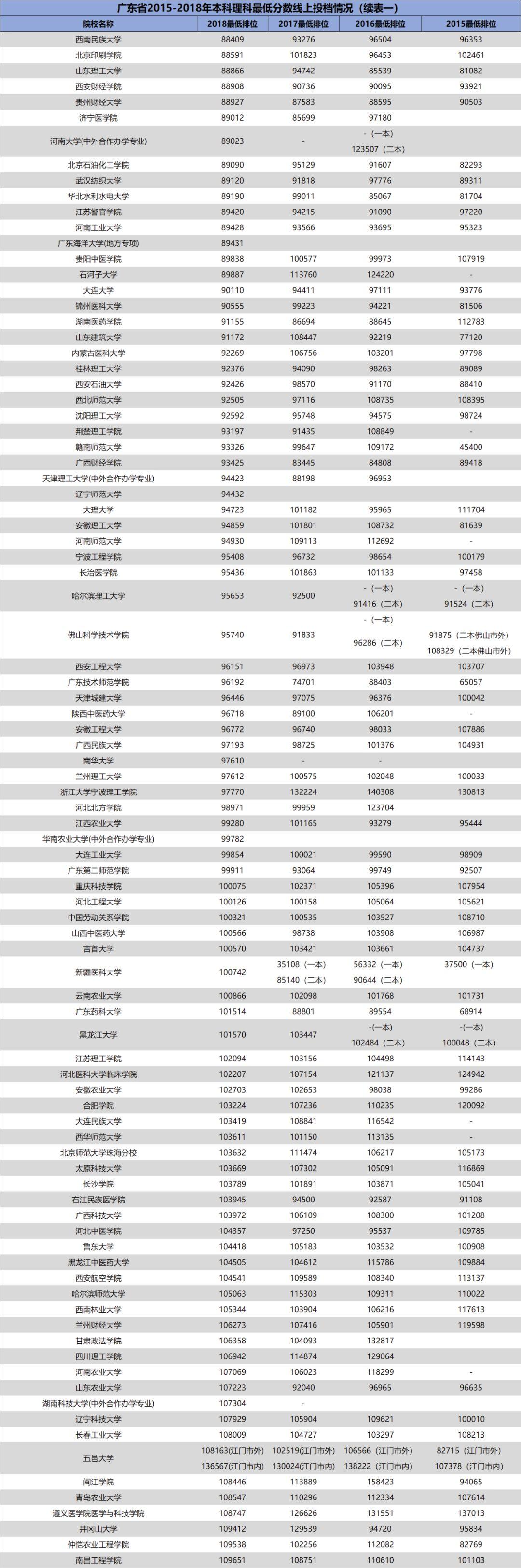 3.自2018年开始广东省一本、二本合并,本科分为优先投档线与最低分数线。2018年部分院校在优先投档线与最低分数线中均有投档情况,此类院校仅保留最低分数线的最低排位。