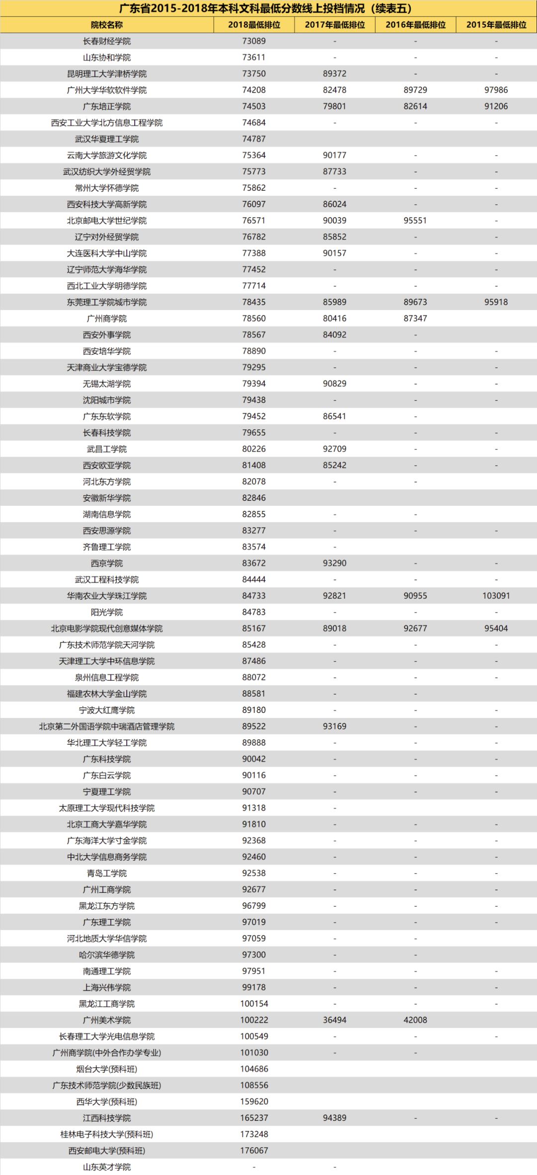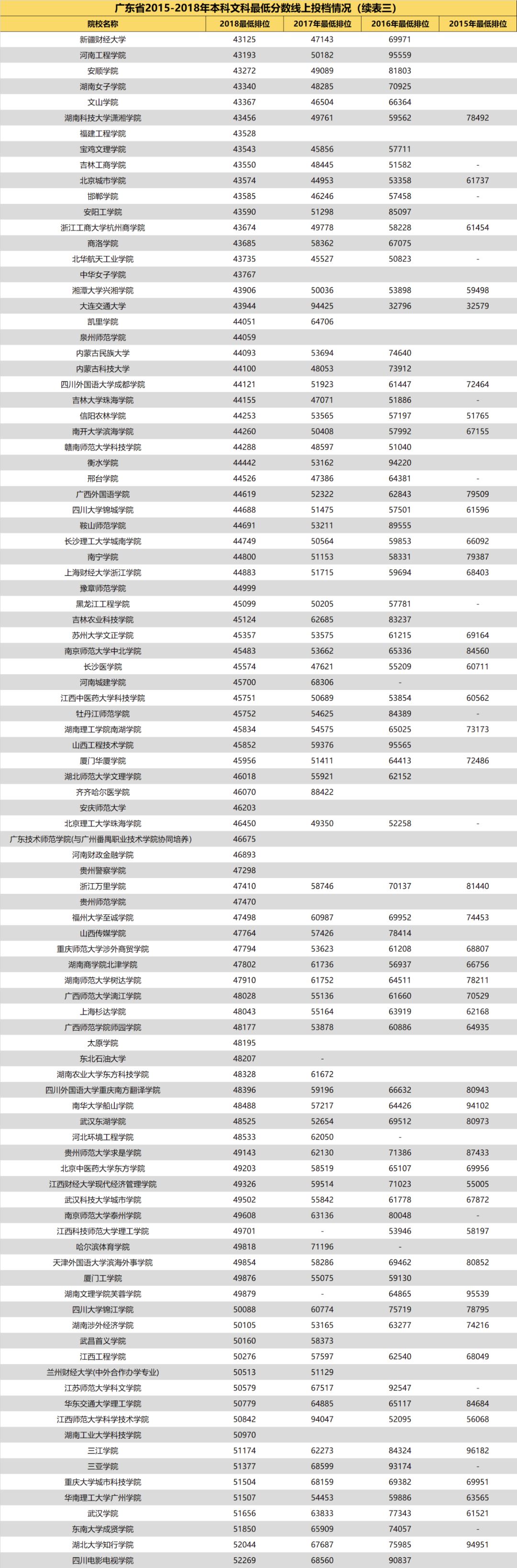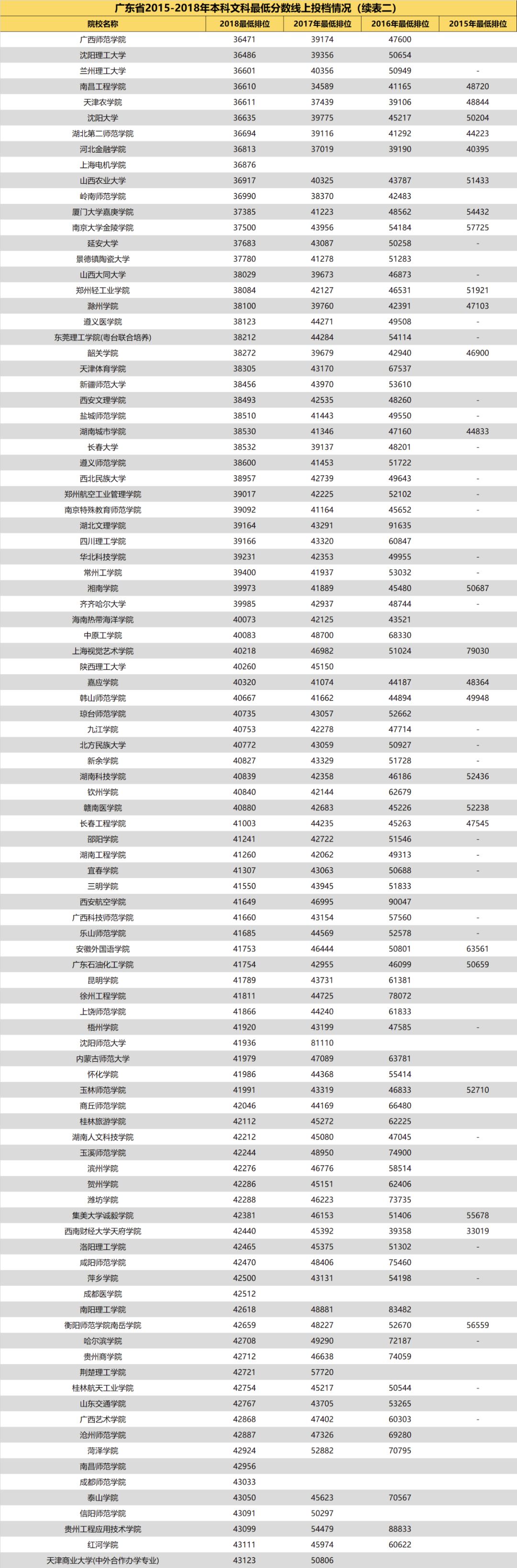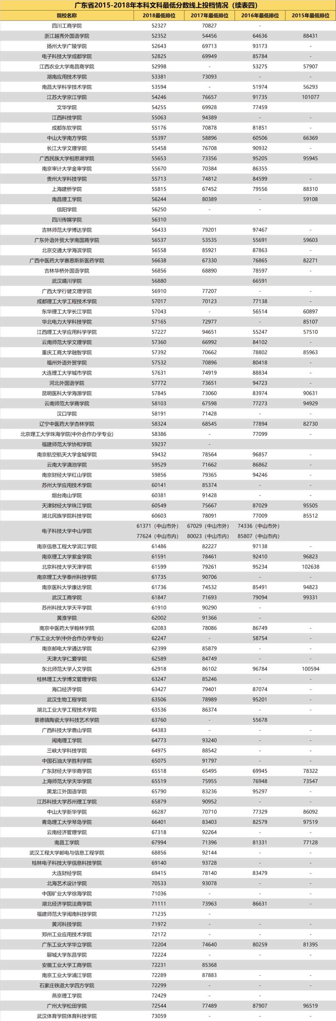 3.自2018年开始广东省一本、二本合并,本科分为优先投档线与最低分数线。2018年部分院校在优先投档线与最低分数线中均有投档情况,此类院校仅保留最低分数线的最低排位。