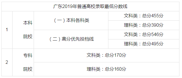 2019年6月25日,广东省教育考试院公布2019年广东高考各批次院校录取最低分数线,本科批次为文科455分,理科390分;专科批次为文科170分,理科160分。7月7日正式开始录取工作。