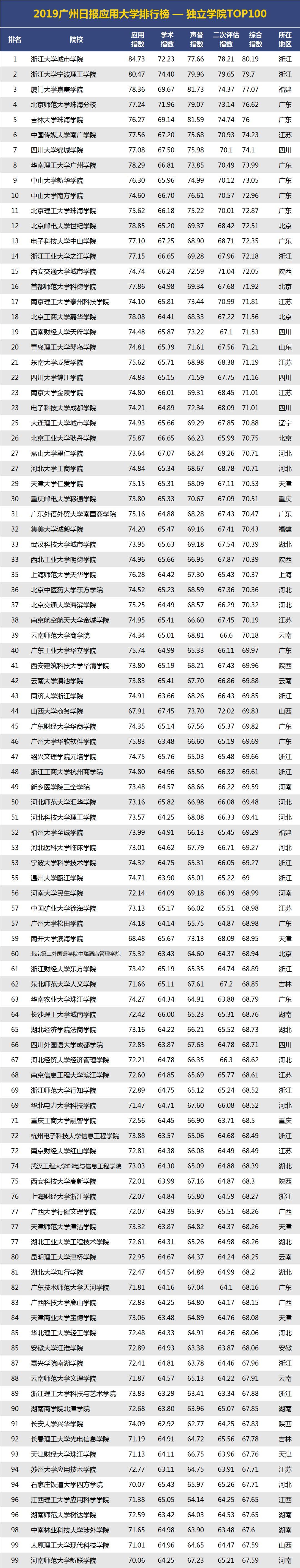 2019年5月10日,广州日报数据和数字化研究院(GDI智库)发布“2019广州日报应用大学排行榜”。在此基础上,研制团队针对榜单中独立学院的入围情况,形成了“2019广州日报应用大学排行榜—独立学院TOP100”(以下简称“独立学院TOP100”)。