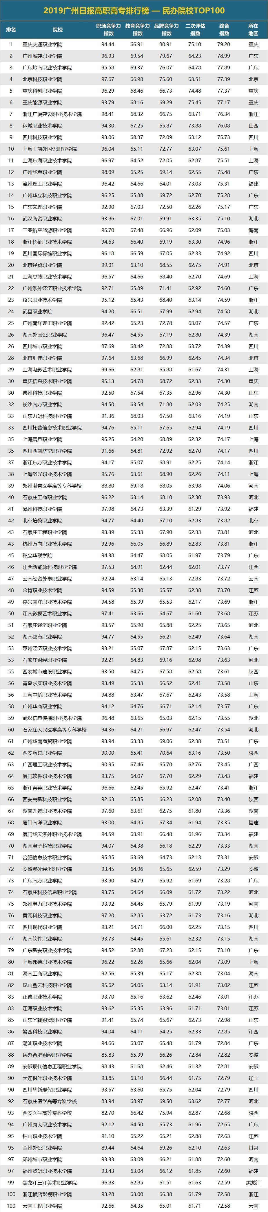 民办院校作为高职高专教育的重要组成部分,是中国高等教育的重要力量。在“2019广州日报高职高专排行榜—TOP1000”的基础上,GDI智库推出“2019广州日报高职高专排行榜—民办院校TOP100”(以下简称“民办院校TOP100”)。