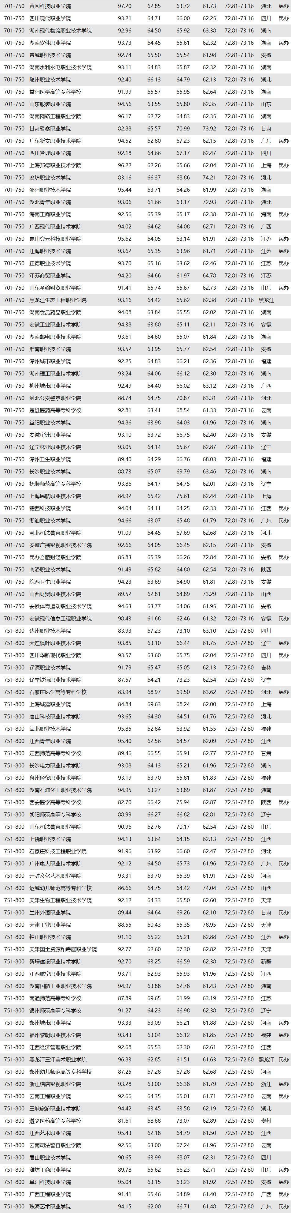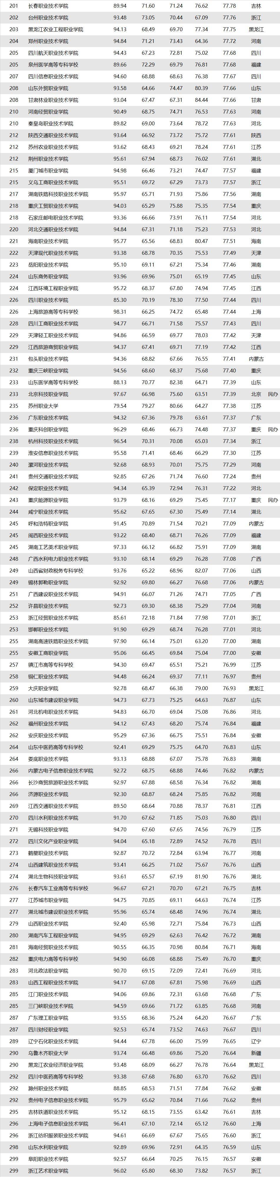 榜单排名前三位院校分别是:深圳职业技术学院(综合指数为100)、金华职业技术学院(综合指数为87.49)和南京工业职业技术学院(综合指数为87.09)。第四名到第十名依次是:无锡职业技术学院(87.08)、广东轻工职业技术学院(86.66)、重庆电子工程职业学院(86.23)、顺德职业技术学院(86.19)、重庆工业职业技术学院(86.17)、四川建筑职业技术学院(85.85)、浙江金融职业学院(85.73)。