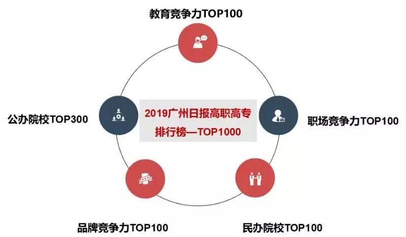 “2019广州日报高职高专排行榜”以“一大五小”的格局呈现。“一大”指的是“2019广州日报高职高专排行榜—TOP1000”,公布本次排行榜的1000强高职高专;“五小”分别指的是:“2019广州日报高职高专排行榜—公办院校TOP300”、“2019广州日报高职高专排行榜—民办院校TOP100”、“2019广州日报高职高专排行榜—职场竞争力TOP100”、“2019广州日报高职高专排行榜—教育竞争力TOP100”和“2019广州日报高职高专排行榜—品牌竞争力TOP100”。
