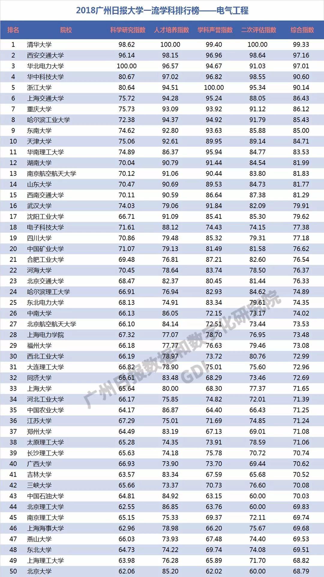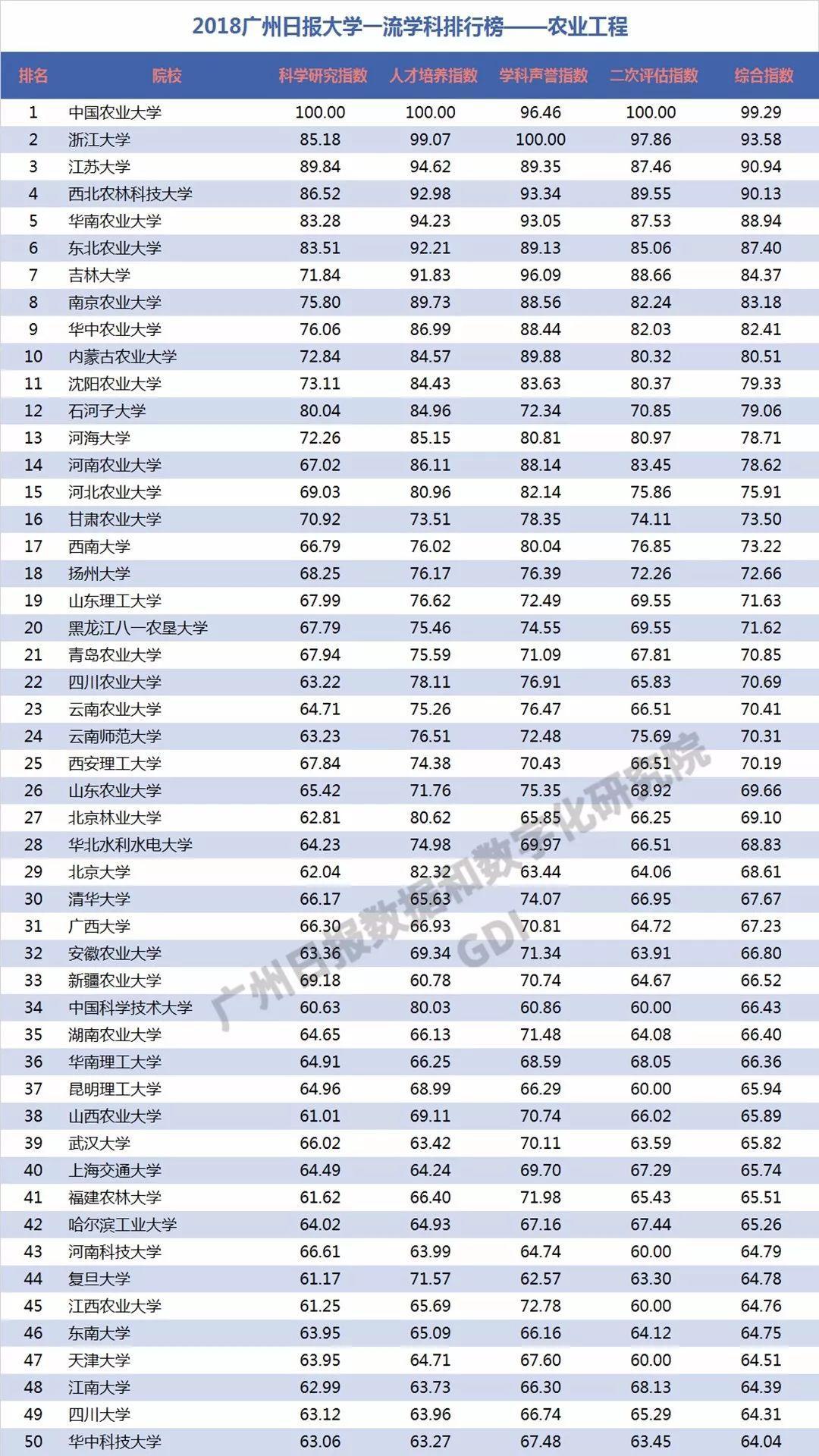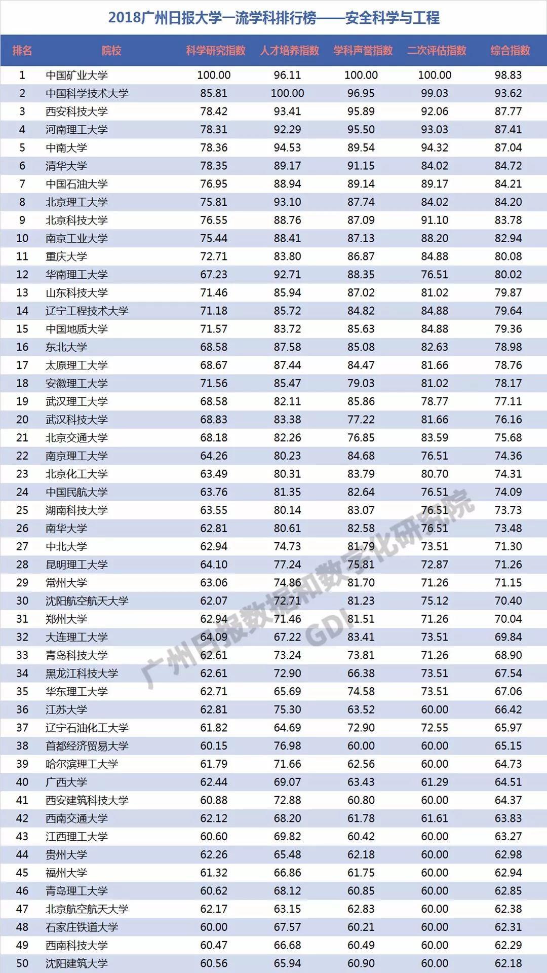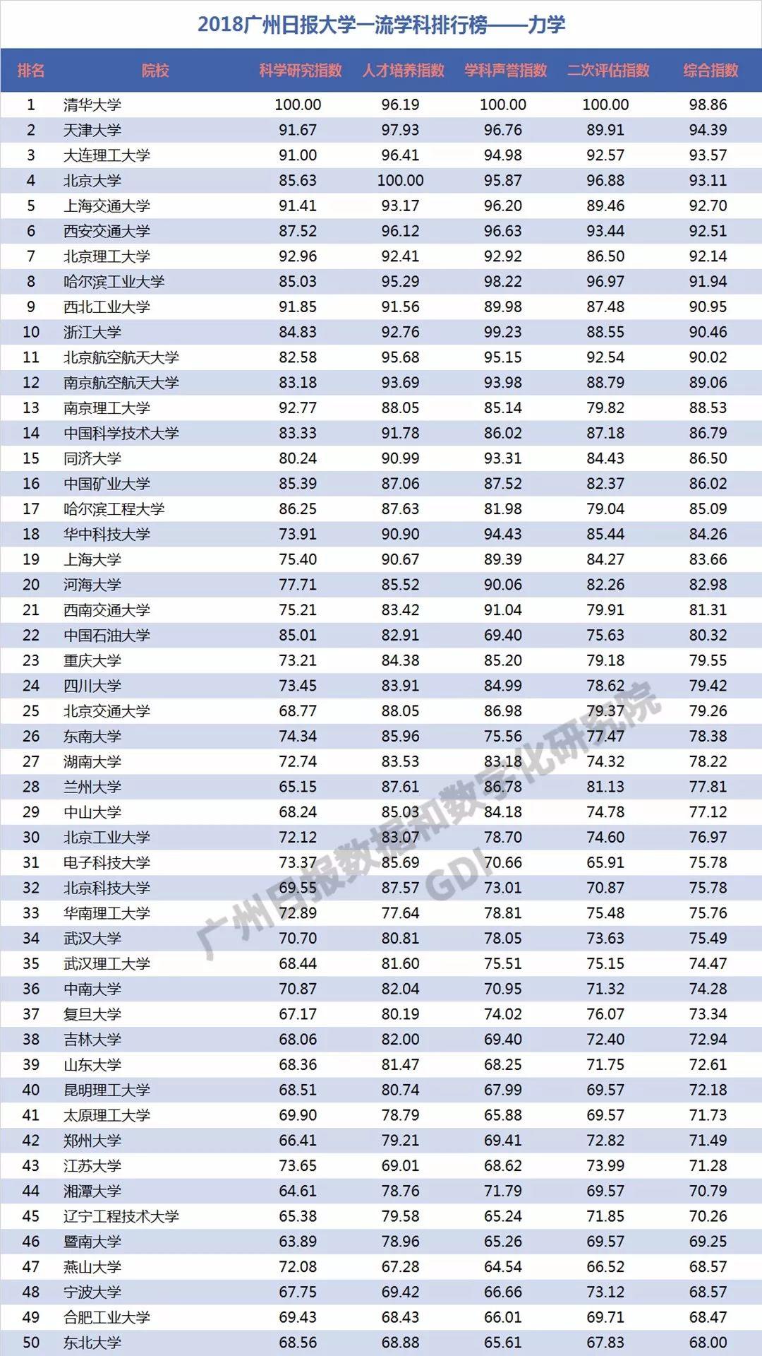 下面GDI对其中37个工程学科进行分析,分别列出每个学科的前50强:力学、机械工程、光学工程、仪器科学与技术、材料科学与工程、冶金工程、动力工程及工程热物理、电气工程、电子科学与技术、信息与通信工程、控制科学与工程、计算机科学与技术、建筑学、土木工程、水利工程、测绘科学与技术、化学工程与技术、地质资源与地质工程、矿业工程、石油与天然气工程、纺织科学与工程、轻工技术与工程、交通运输工程、船舶与海洋工程、航空宇航科学与技术、兵器科学与技术、核科学与技术、农业工程、林业工程、环境科学与工程、生物医学工程、食品科学与工程、城乡规划学、风景园林学、软件工程、管理科学与工程、安全科学与工程。