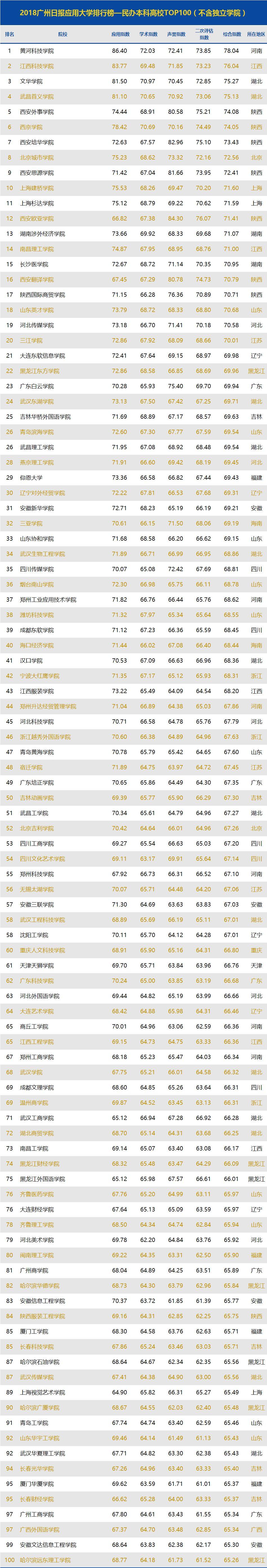 在榜单中,综合指数排名前十的民办本科高校依次为黄河科技学院、文华学院、武昌首义学院、西安外事学院、西京学院、西安培华学院、北京城市学院、西安思源学院和上海建桥学院。在民办本科高校排名中领先的黄河科技学院,在综合排名中是第87名。