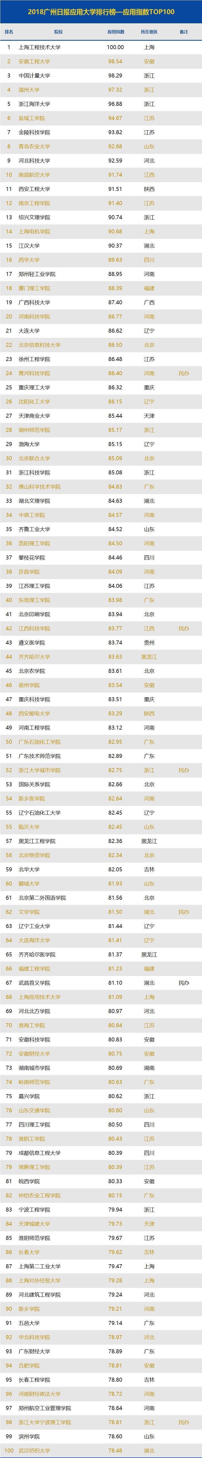 社会服务是高校的基本职能之一。在新的时代要求下,高校为区域经济社会发展服务的能力,为行业企业技术进步服务的能力,显得更为重要。“2018广州日报应用大学排行榜”研制团队对高校的应用指数这一重要指标进行分析,形成“2018广州日报应用大学排行榜—应用指数TOP100”(以下简称“应用指数TOP100”)。