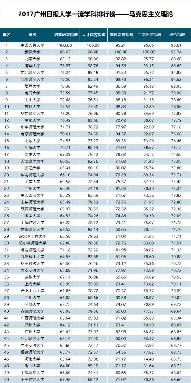 在“2017广州日报大学一流学科排行榜——马克思主义理论”榜单中,中国人民大学以综合指数98.61位居第一位;排在第二位的是武汉大学,其综合指数为93.74;第三名是北京大学(综合指数为88.66)。