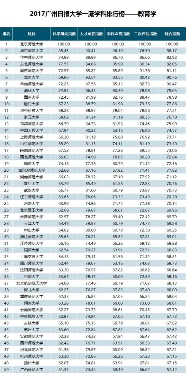 在“2017广州日报大学一流学科排行榜——教育学”榜单中,北京师范大学以综合指数100.00位居第一位;排在第二位的是华东师范大学,其综合指数为88.17;第三名是华中师范大学(综合指数为82.92)。