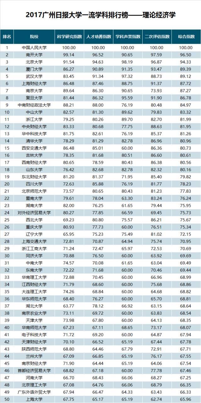 在“2017广州日报大学一流学科排行榜——理论经济学”榜单中,中国人民大学以综合指数100.00位居第一位;排在第二位的是南开大学,其综合指数为96.50;第三名是北京大学(综合指数为94.33)。