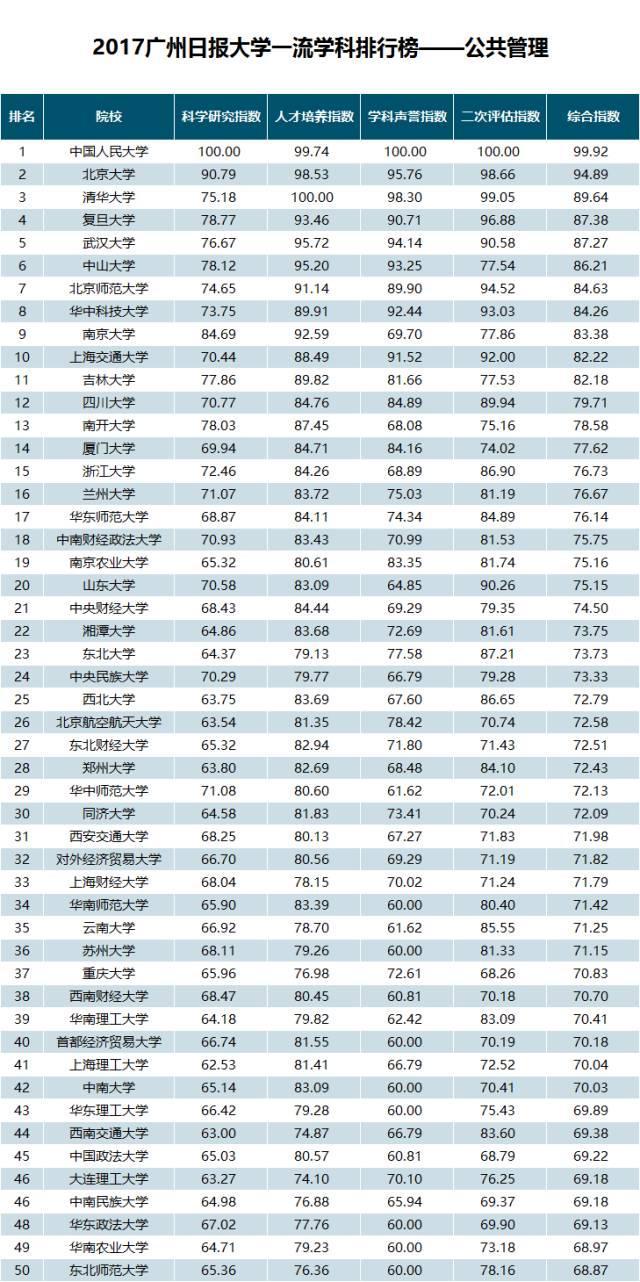 在“2017广州日报大学一流学科排行榜——公共管理”榜单中,中国人民大学以综合指数99.92位居第一位;排在第二位的是北京大学,其综合指数为94.89;第三名是清华大学(综合指数为89.64)。