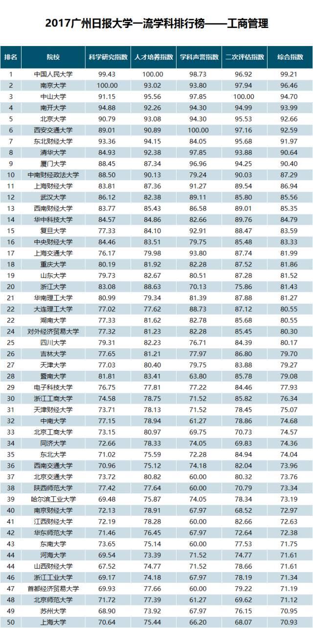 在“2017广州日报大学一流学科排行榜——工商管理”榜单中,中国人民大学以综合指数99.21位居第一位;排在第二位的是南京大学,其综合指数为96.46;第三名是中山大学(综合指数为94.70)。