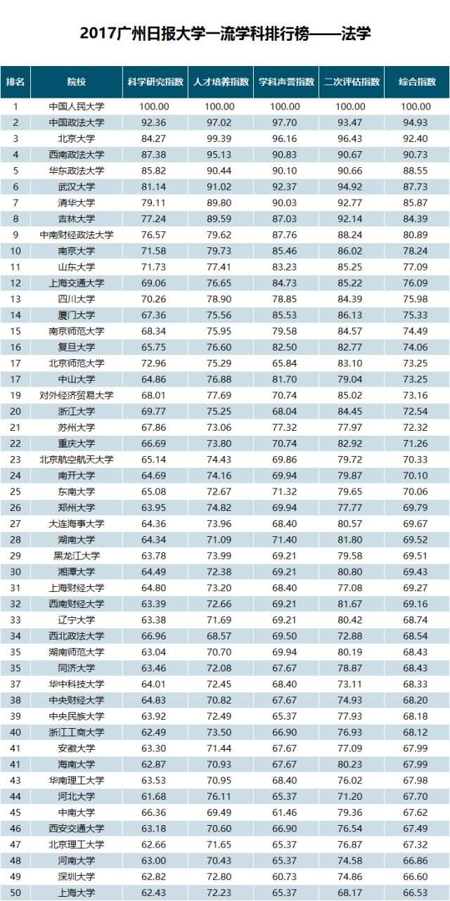 在“2017广州日报大学一流学科排行榜——法学”榜单中,中国人民大学以综合指数100.00位居第一位;排在第二位的是中国政法大学,其综合指数为94.93;第三名是北京大学(综合指数为92.40)。