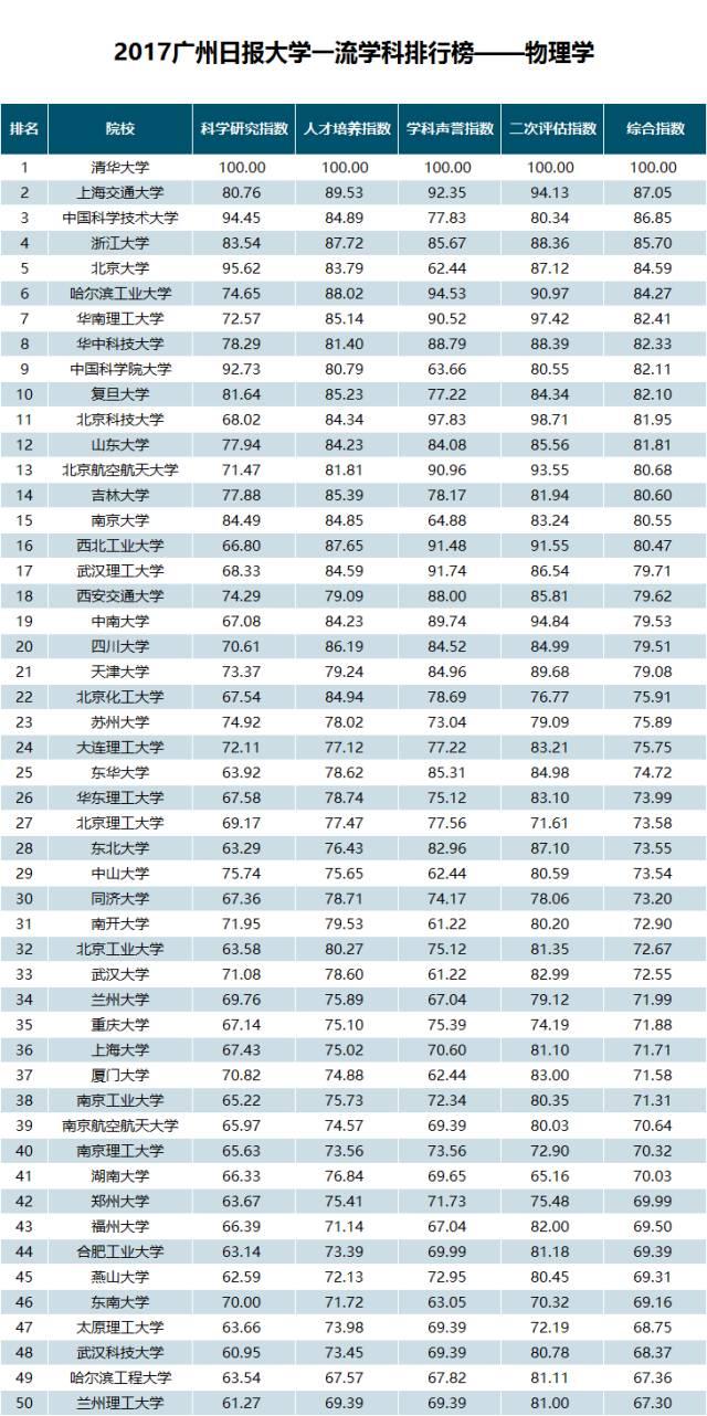 在“2017广州日报大学一流学科排行榜——物理学”榜单中,清华大学以综合指数100.00位居第一位;排在第二位的是上海交通大学,其综合指数为87.05;第三名是中国科学技术大学(综合指数为86.85)。