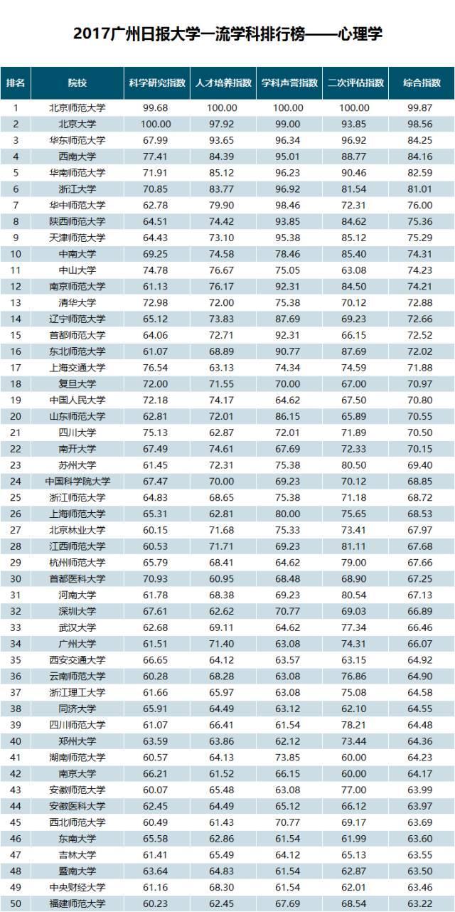 在“2017广州日报大学一流学科排行榜——心理学”榜单中,北京师范大学以综合指数99.87位居第一位;排在第二位的是北京大学,其综合指数为98.56;第三名是华东师范大学(综合指数为84.25)。