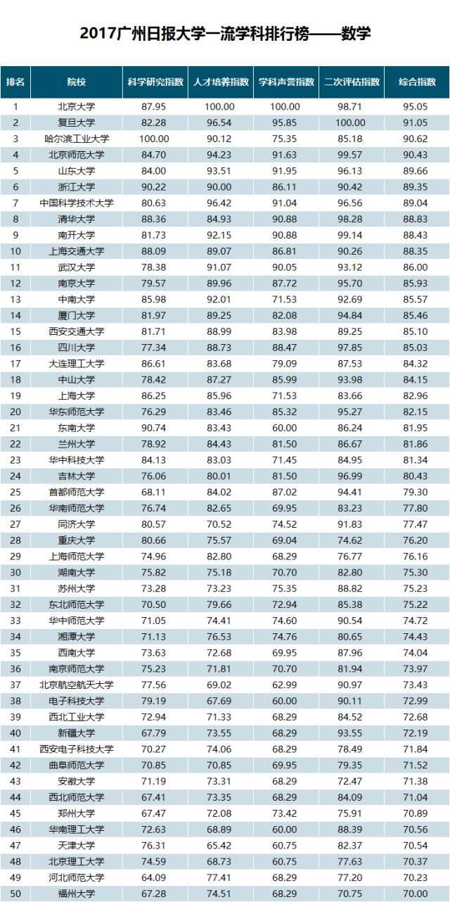在“2017广州日报大学一流学科排行榜——数学”榜单中,北京大学以综合指数95.05位居第一位;排在第二位的是复旦大学,其综合指数为91.05;第三名是哈尔滨工业大学(综合指数为90.62)。