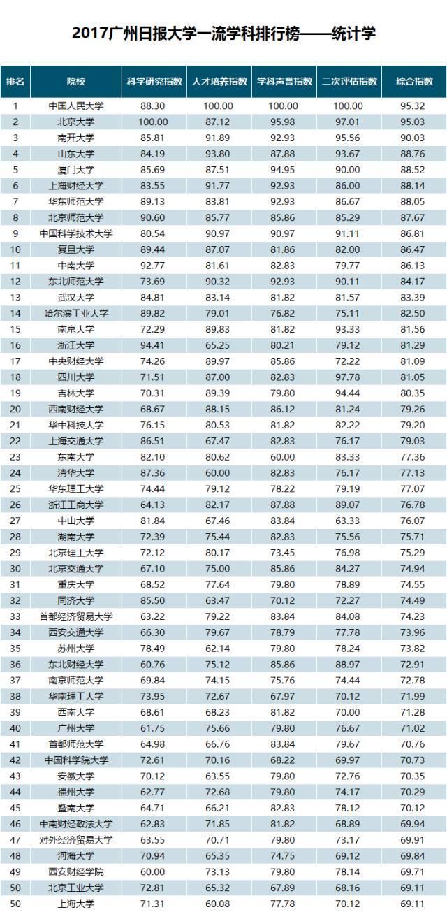 在“2017广州日报大学一流学科排行榜——统计学”榜单中,中国人民大学以综合指数95.32位居第一位;排在第二位的是北京大学,其综合指数为95.03;第三名是南开大学(综合指数为90.03)。
