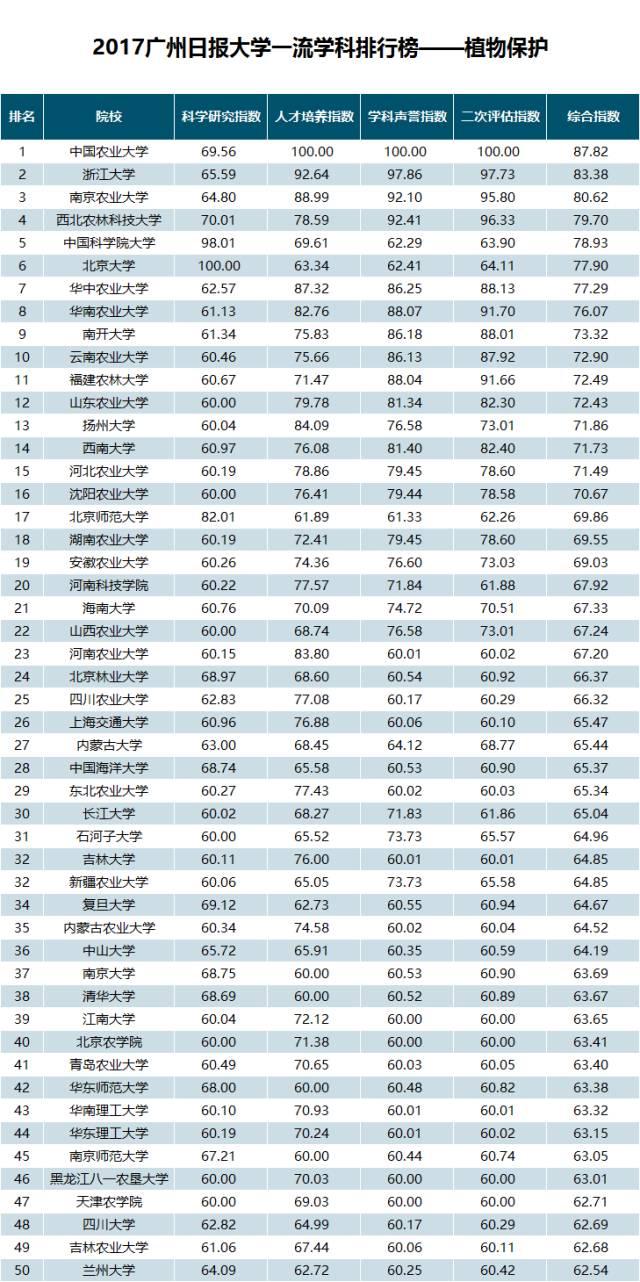 在“2017广州日报大学一流学科排行榜——植物保护”榜单中,中国农业大学以综合指数87.82位居第一位;排在第二位的是浙江大学,其综合指数为83.38;第三名是南京农业大学(综合指数为80.62)。
