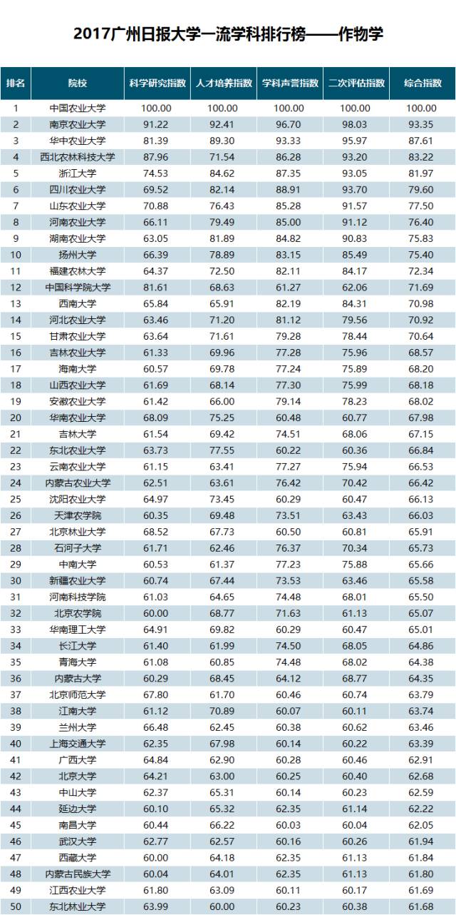 在作物学前50院校中,中国农业大学科学研究指数、人才培养指数、学科声誉指数和二次评估指数均排在全国第一位。
