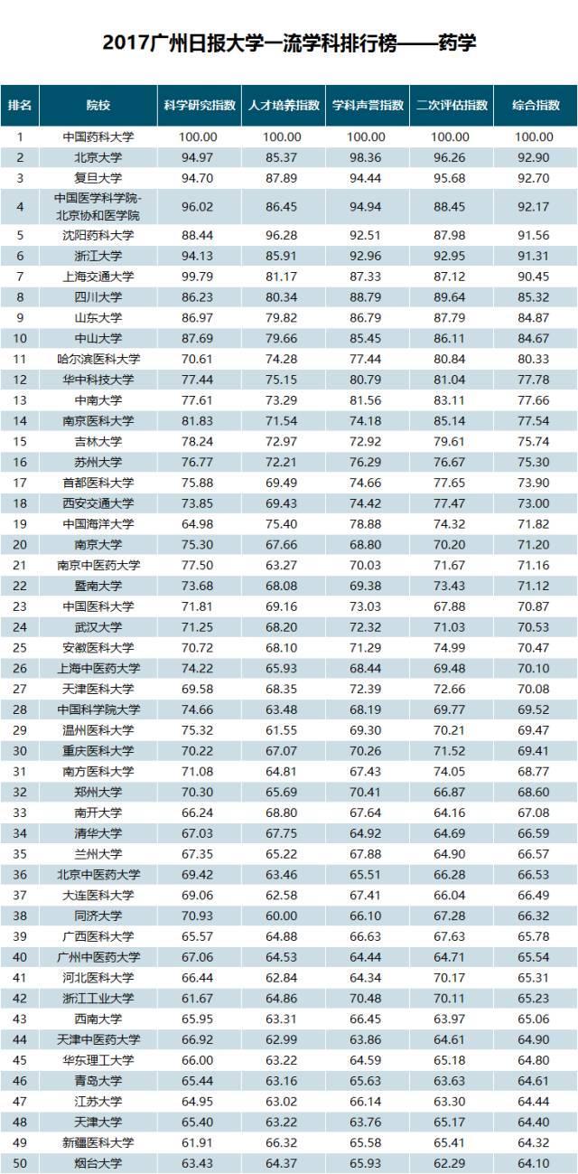 在“2017广州日报大学一流学科排行榜——药学”榜单中,中国药科大学以综合指数100.00位居第一位;排在第二位的是北京大学,其综合指数为92.90;第三名是复旦大学(综合指数为92.70)。