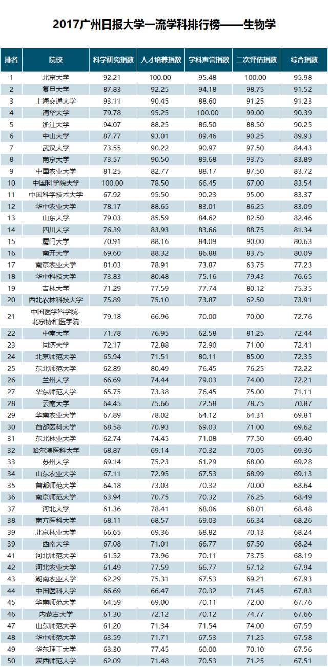 “2017广州日报大学一流学科排行榜——生物学”榜单具体情况如下:
