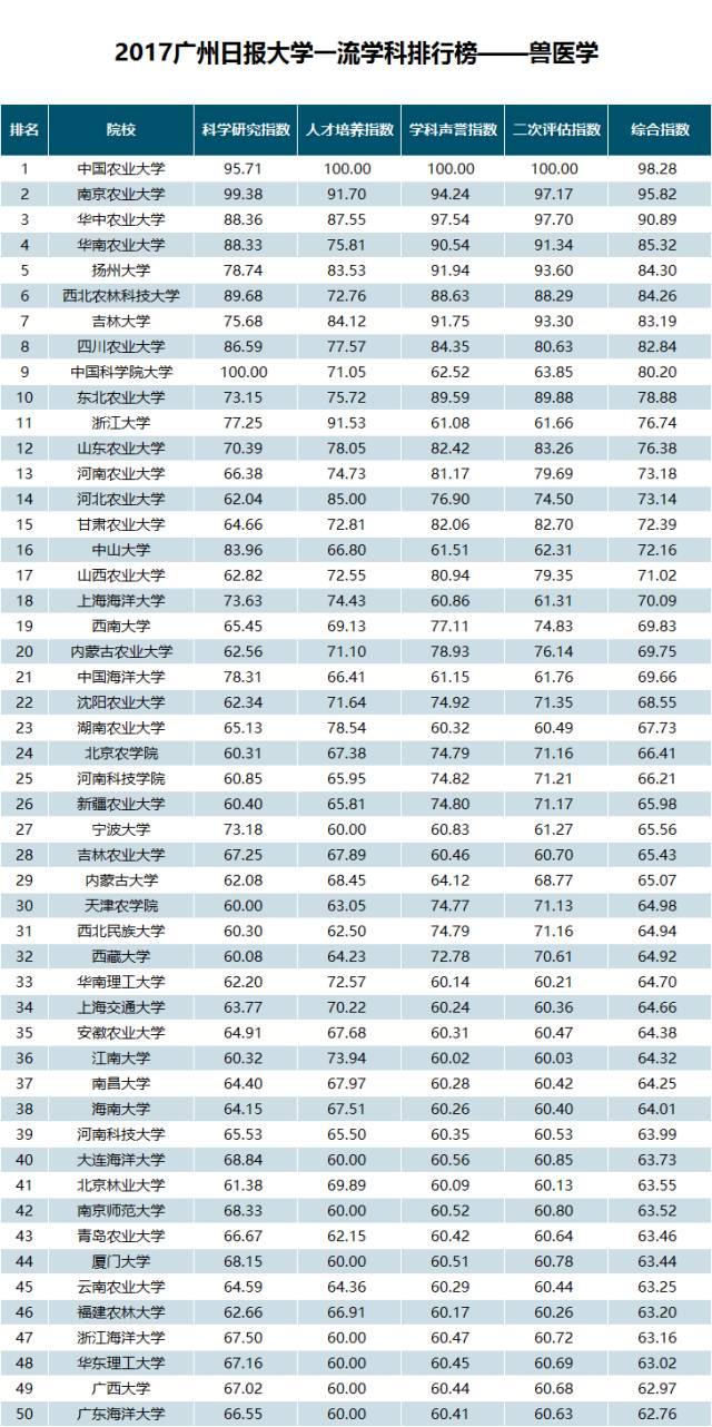 “2017广州日报大学一流学科排行榜——兽医学”榜单具体情况如下: