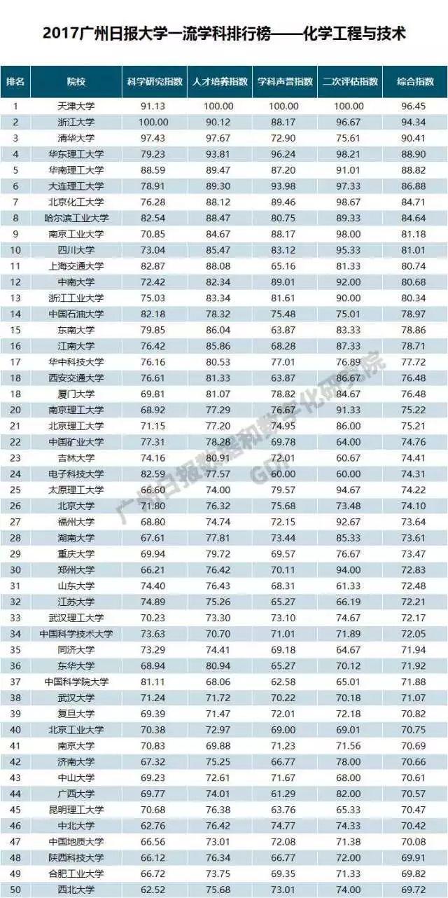 在“2017广州日报大学一流学科排行榜——化学工程与技术”榜单中,天津大学以综合指数96.45位居第一;排在第二位的是浙江大学,其综合指数为94.34;第三名是清华大学(综合指数为90.41)。在化学工程与技术学科前50院校中,有3个院校综合指数90以上,有13个院校综合指数80以上,有47个院校综合指数均在70以上。