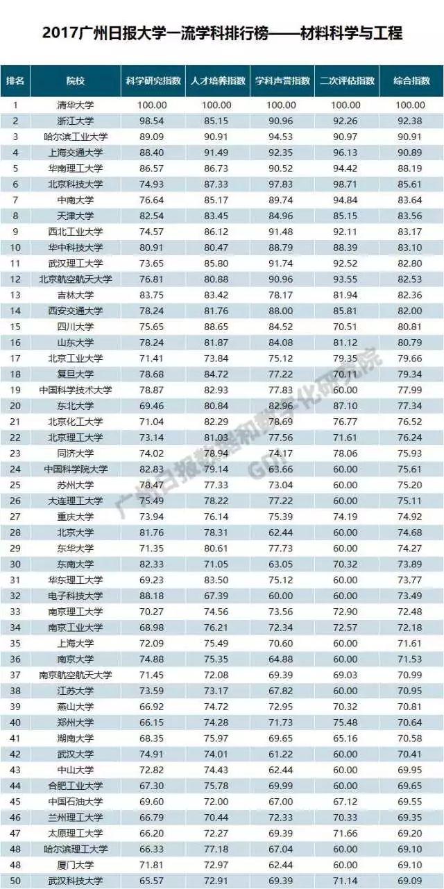 在“2017广州日报大学一流学科排行榜——材料科学与工程”榜单中,清华大学以综合指数100位稳居第一位;排在第二位的是浙江大学,其综合指数为92.38;第三名是哈尔滨工业大学(综合指数为90.91)。在材料科学与工程学科前50院校中,有4个院校综合指数90以上,有16个院校综合指数16以上,有42个院校综合指数70以上,所有院校综合指数均在60以上。