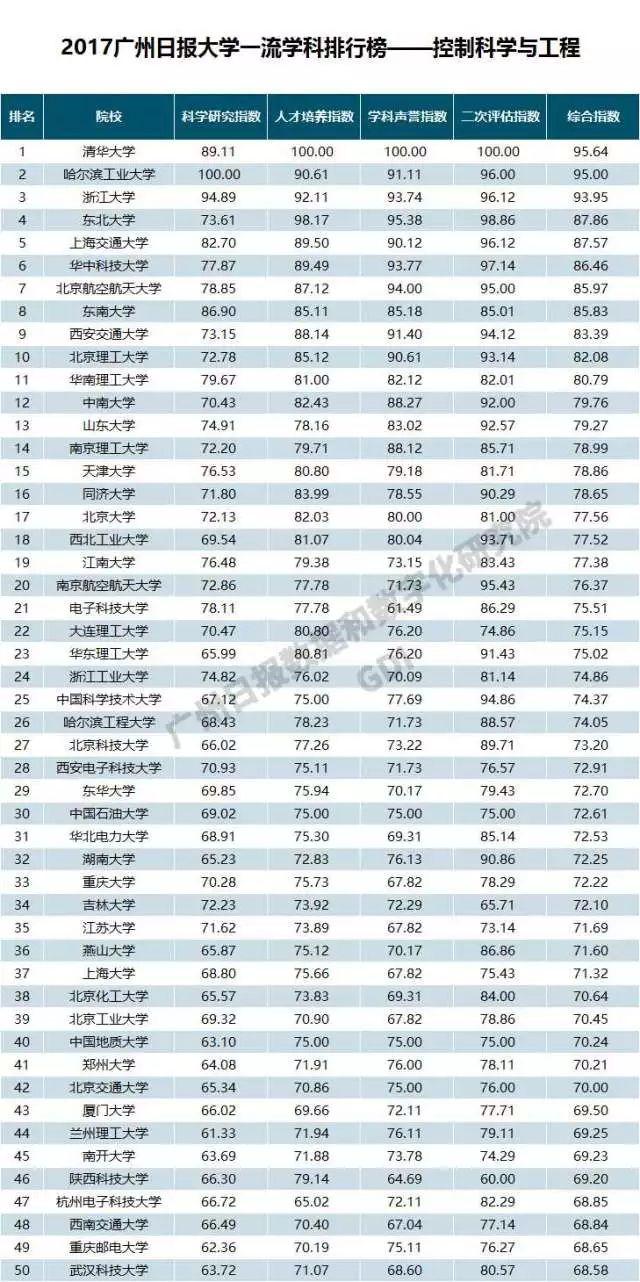 在“2017广州日报大学一流学科排行榜——控制科学与工程”榜单中,清华大学以综合指数95.64位居第一(其科学研究指数为89.11,人才培养指数、学科声誉指数和二次评估指数均为100);排在第二位的是哈尔滨工业大学,其综合指数为95.00;第三名是浙江大学,其综合指数为93.95。在控制科学与工程学科前50院校中,有3个院校综合指数90以上,有11个院校综合指数80以上,有42个院校综合指数均在70以上,综合指数最低为68.58。