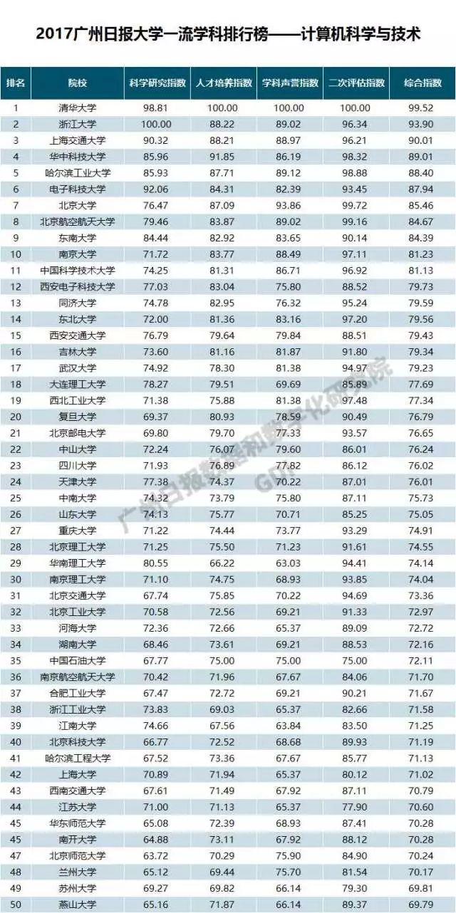 在“2017广州日报大学一流学科排行榜——计算机科学与技术”榜单中,清华大学以综合指数99.52位居第一(其科学研究指数为98.81,人才培养指数、学科声誉指数和二次评估指数均为100);排在第二位的是浙江大学,其综合指数为93.90;第三名是上海交通大学,其综合指数为90.01。在计算机科学与技术学科前50院校中,有3个院校综合指数90以上,有11个院校综合指数80以上,有48个院校综合指数均在70以上,综合指数最低分为69.79。