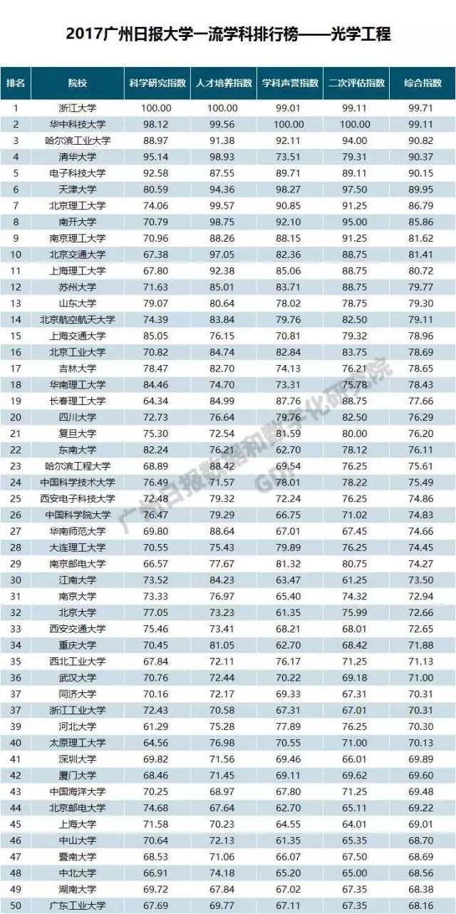 在“2017广州日报大学一流学科排行榜——光学工程”榜单中,浙江大学以综合指数99.71位居第一;排在第二位的是华中科技大学,其综合指数为99.11;第三名是哈尔滨工业大学(综合指数为90.82)。在光学工程学科前50院校中,有5个院校综合指数90以上,有11个院校综合指数80以上,有40个院校综合指数均在70以上。