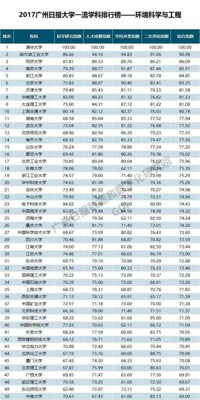 在“2017广州日报大学一流学科排行榜——环境科学与工程”榜单中,清华大学以综合指数100位居第一(其中各分项指标均为100);排在第二位的是哈尔滨工业大学,其综合指数为90.98;第三名是同济大学(综合指数为86.09)。在环境科学与工程学科前50院校中,只有2个院校综合指数90以上,有10个院校综合指数80以上,有46个院校综合指数均在70以上,综合指数最低分为69.00。