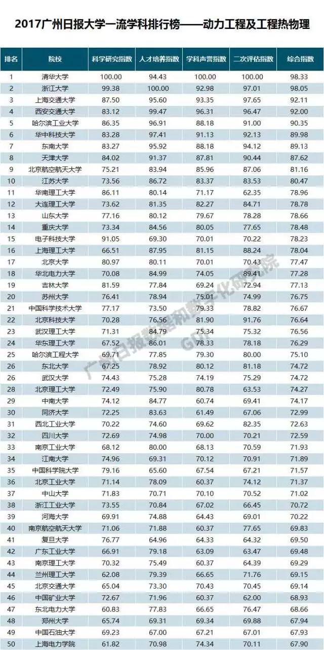 在“2017广州日报大学一流学科排行榜——动力工程及工程热物理”榜单中,清华大学以综合指数98.33位居第一;排在第二位的是浙江大学,其综合指数为98.05;第三名是上海交通大学(综合指数为92.11)。在动力工程及工程热物理学科前50院校中,有5个院校综合指数90以上,有10个院校综合指数80以上,有39个院校综合指数均在70以上。