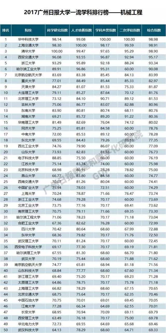 在“2017广州日报大学一流学科排行榜——机械工程”榜单中,华中科技大学以综合指数98.98位居第一(其科学研究指数为98.14,人才培养指数为99.08,学科声誉指数和二次评估指数均为100);排在第二位的是上海交通大学,其综合指数为98.91;第三名是清华大学,其综合指数为98.90。在机械工程学科前50院校中,有6个院校综合指数90以上,有15个院校综合指数80以上,有46个院校综合指数均在70以上,综合指数最低分为69.33。