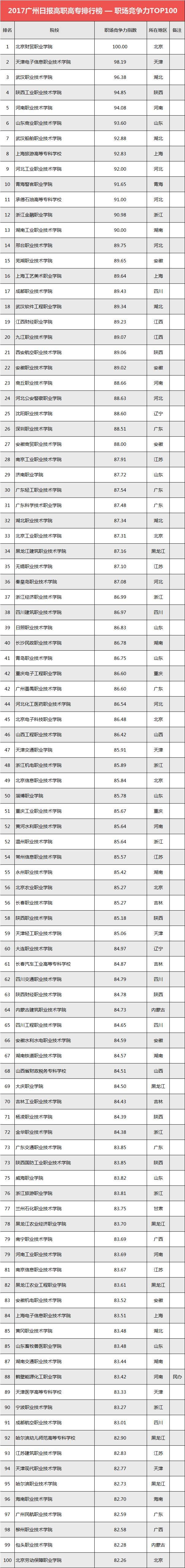 “2017广州日报高职高专排行榜—职场竞争力TOP100”榜单如下: