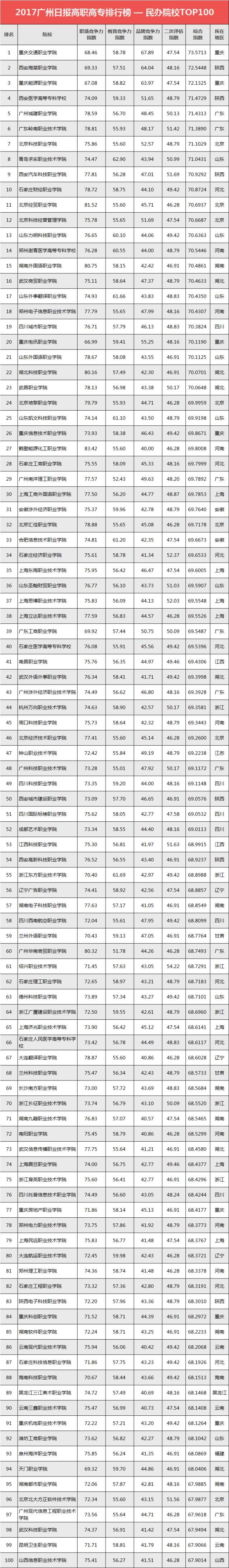 “2017广州日报高职高专排行榜—民办院校TOP100”榜单如下: