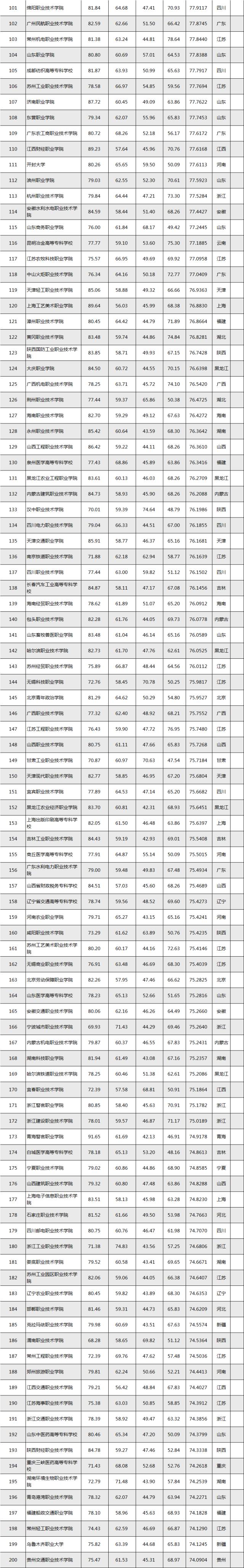 榜单排名前三位院校分别是:深圳职业技术学院、北京电子科技职业学院和浙江金融职业学院。第四名到第十名依次是:陕西工业职业技术学院、常州信息职业技术学院、北京工业职业技术学院、重庆电子工程职业学院、武汉职业技术学院、淄博职业学院、南宁职业技术学院。前十名院校综合指数在89—100之间。