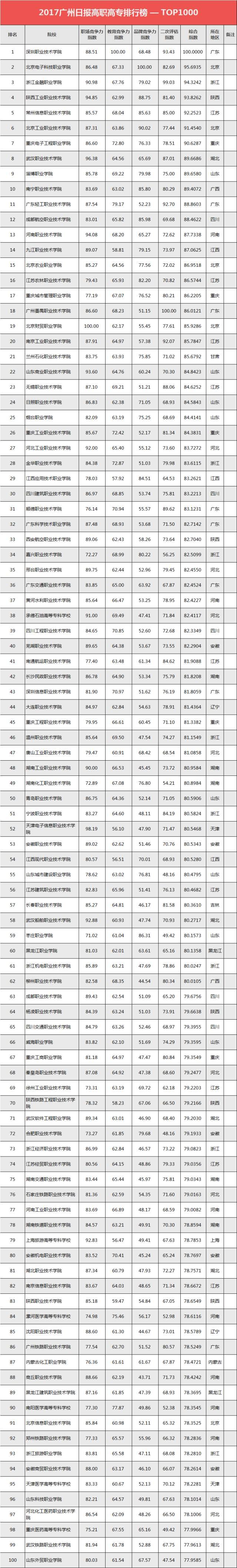 “2017广州日报高职高专排行榜—TOP1000”全榜单如下: