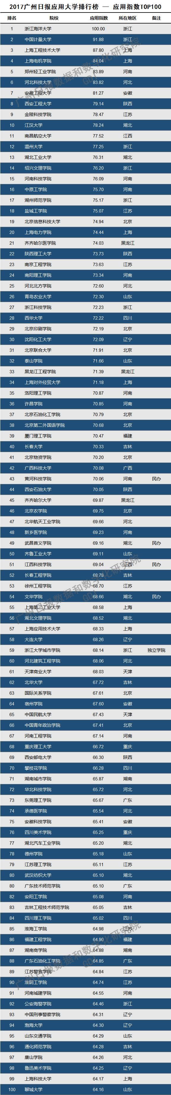 下附“2017广州日报应用大学排行榜 — 应用指数TOP100”的完整榜单: